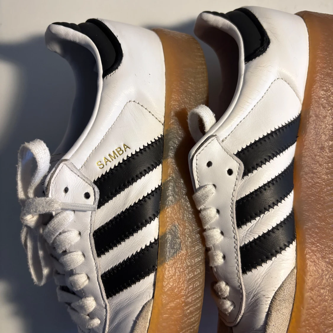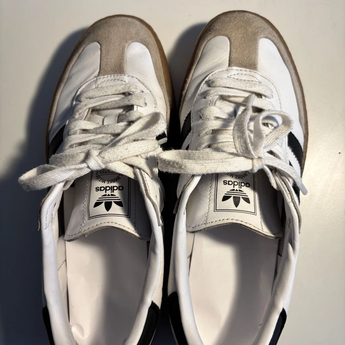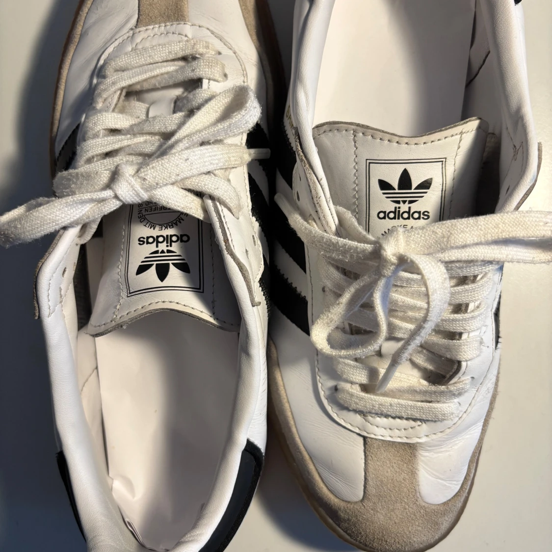 Klassiska Adidas Samba sneakers i vitt skinn med svarta ränder och detaljer. Skorna har en brun gummisula, snörning och rund tå. Tungan är märkt med Adidas- logo. Perfekta för en sportig och stilren look. köp nu och få en grattis tshirt!! Rean slutar om en vecka 🔥🔥🔥