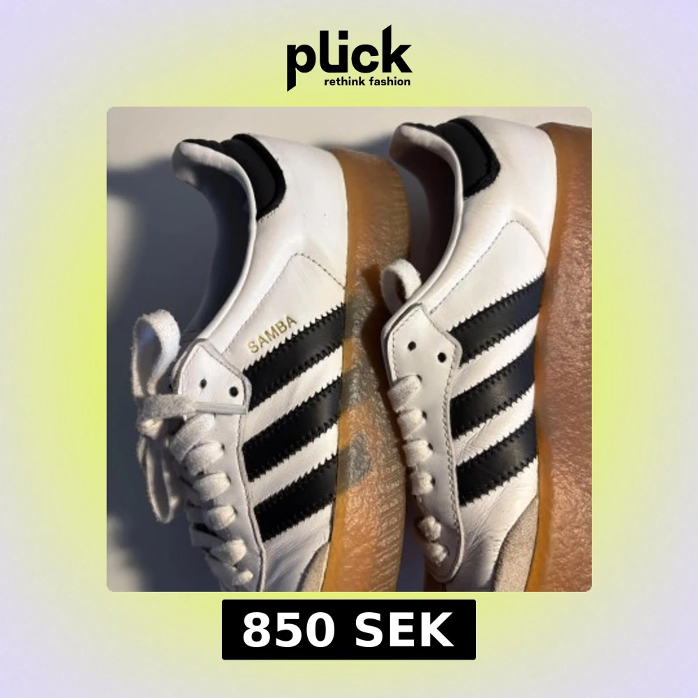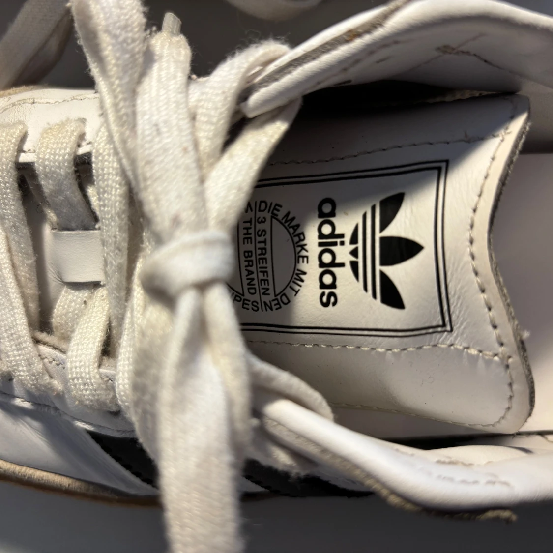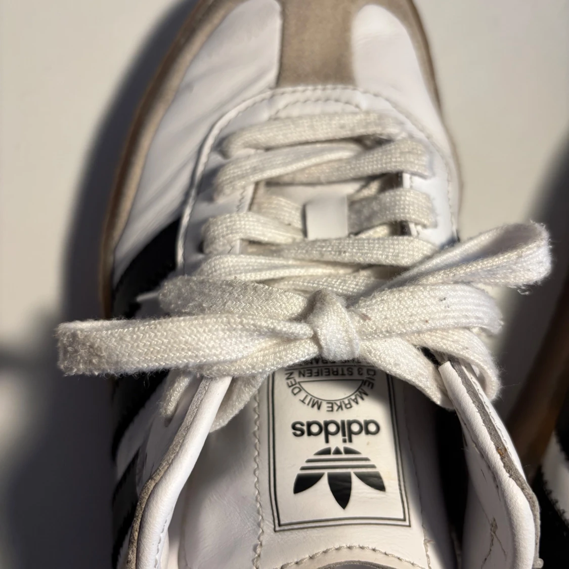 Klassiska Adidas Samba sneakers i vitt skinn med svarta ränder och detaljer. Skorna har en brun gummisula, snörning och rund tå. Tungan är märkt med Adidas- logo. Perfekta för en sportig och stilren look. köp nu och få en grattis tshirt!! Rean slutar om en vecka 🔥🔥🔥