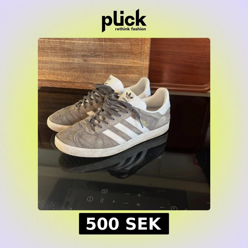 Säljer ett par klassiska Adidas Gazelle sneakers i grå mocka med vita detaljer och de ikoniska tre ränderna på sidorna. Skorna har vit plös och häl, samt grå snörning och platt sula. Perfekta för dig som gillar retrostil och streetwear.