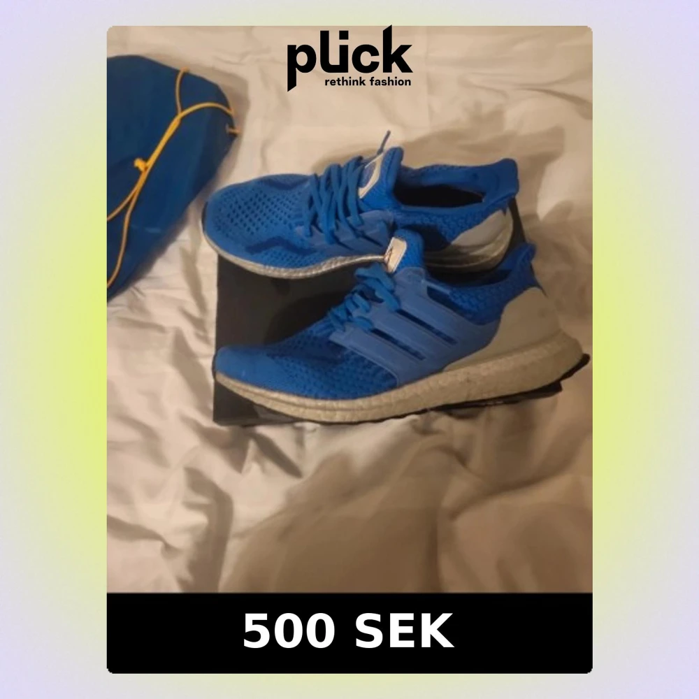 Säljer ett par blå Adidas Ultraboost sneakers med vit och svart sula. Ovandelen är i ventilerande syntetmaterial och har snörning. Skorna har en klassisk rund tå och platt sula, perfekt för dig som gillar sportig stil och komfort.Kom gärna med prisförslag också