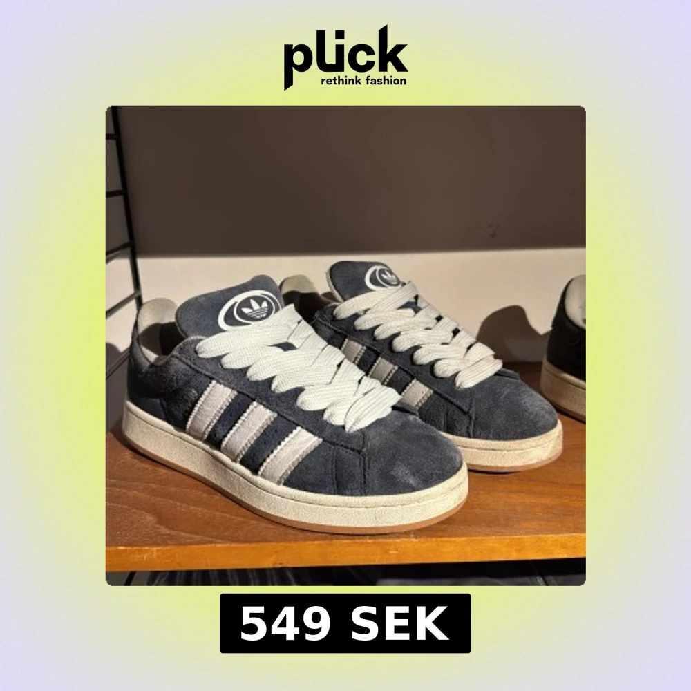 Säljer ett par Adidas Campus sneakers i mörkblå mocka med klassiska vita ränder och breda vita skosnören. Skorna har en platt sula i gummi och rund tå. Adidas logga syns både på plösen och hälen. Perfekta för dig som gillar retrostil och streetwear. Kartong och kvitto finns