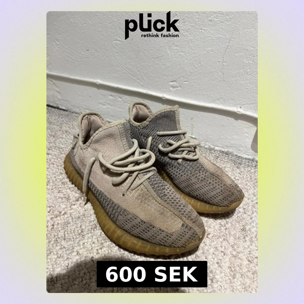 Säljer ett par Adidas Yeezy Boost 350 V2 i färgen Earth. Skorna har en stickad ovandel i beige och grå toner, med matchande snörning och en brun, genomskinlig gummisula. Ikonisk siluett och bekväm passform, perfekt för dig som gillar streetwear.