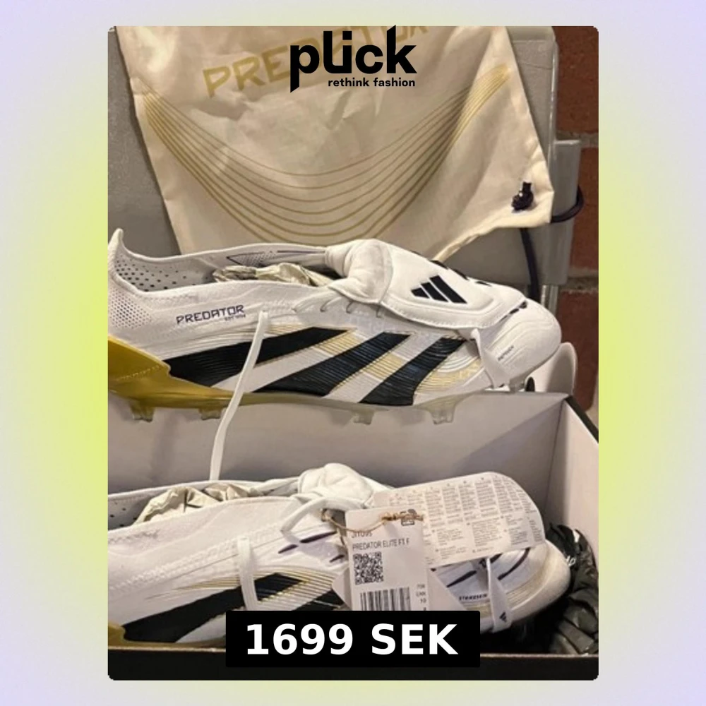 Adidas Predator Elite FT är grymma fotbollsskor i vitt med svarta och guldiga detaljer. Snygg design med snörning, låg profil och mönstrad sula för max grepp på planen. Skorna har en platt sula med dobbar och är tillverkade i syntetmaterial för lätt känsla och bra passform.