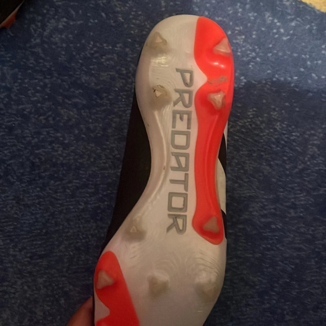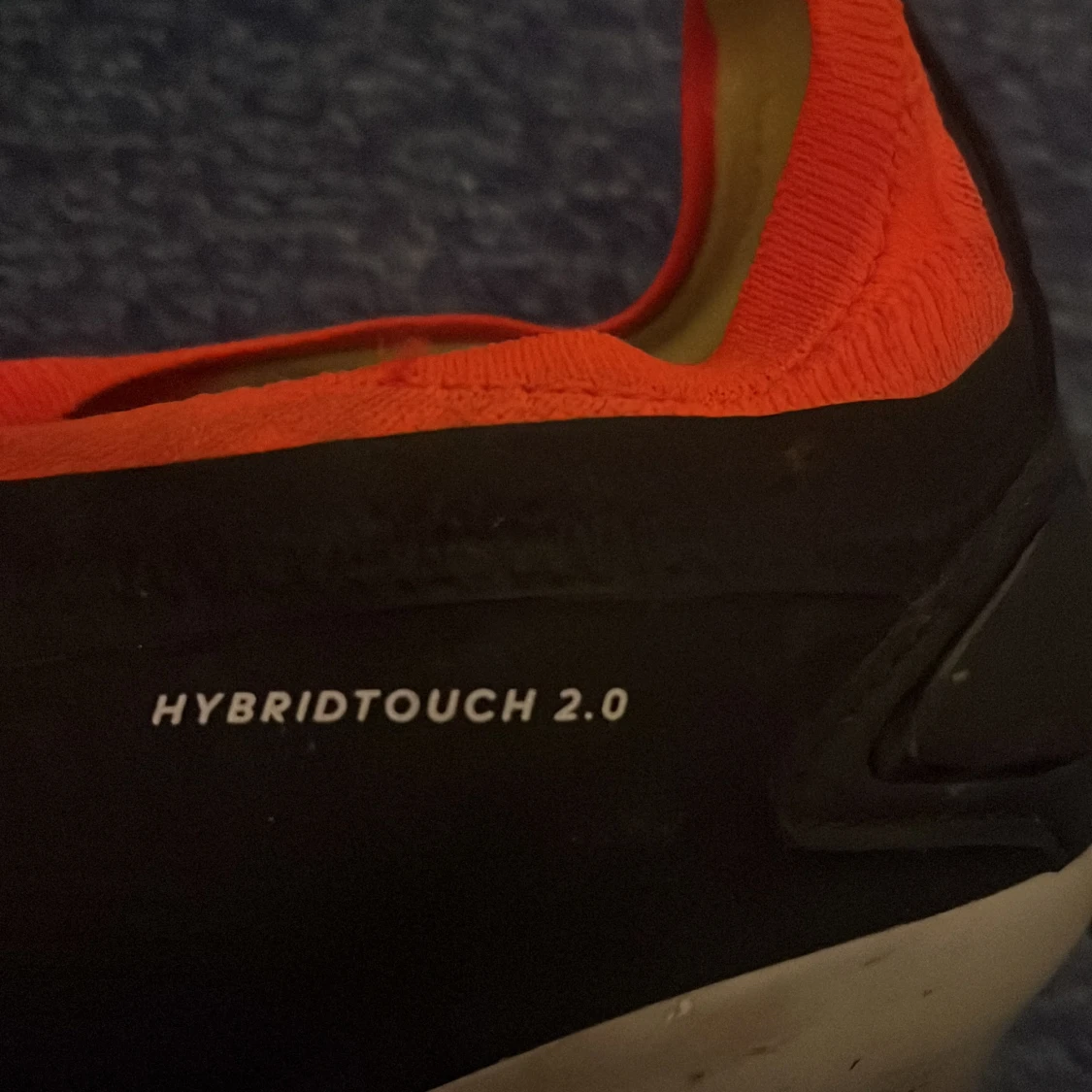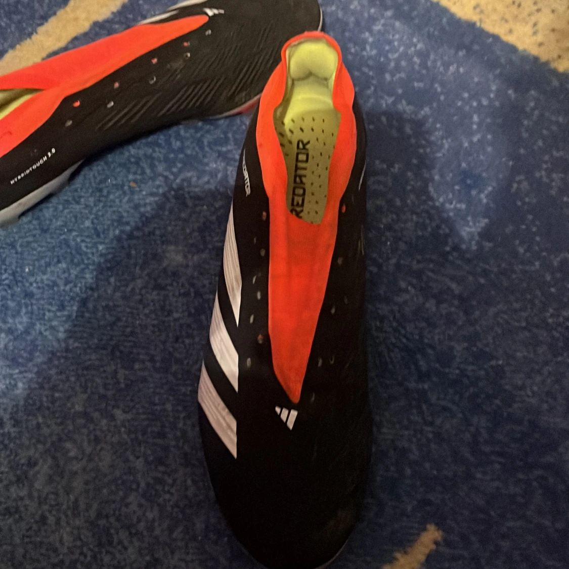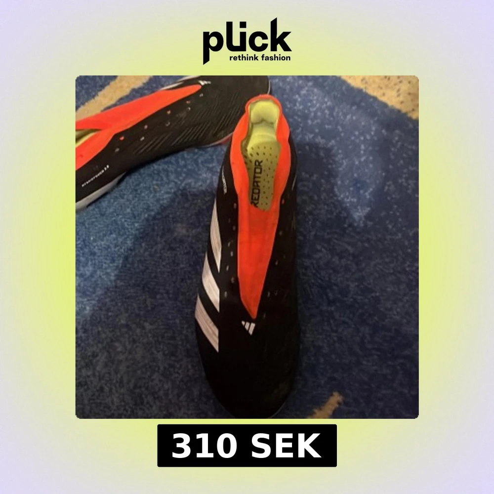 Adidas Predator fotbollsskor med Hybridtouch 2.0-teknologi. Skorna är svarta med röda och vita detaljer, har en låg profil och platt sula med dobbar för gräs. Insidan är limegrön och ovandelen är tillverkad i syntetmaterial för optimal bollkontroll. Snöre följs med. Kommer tvättas innan fraktning.