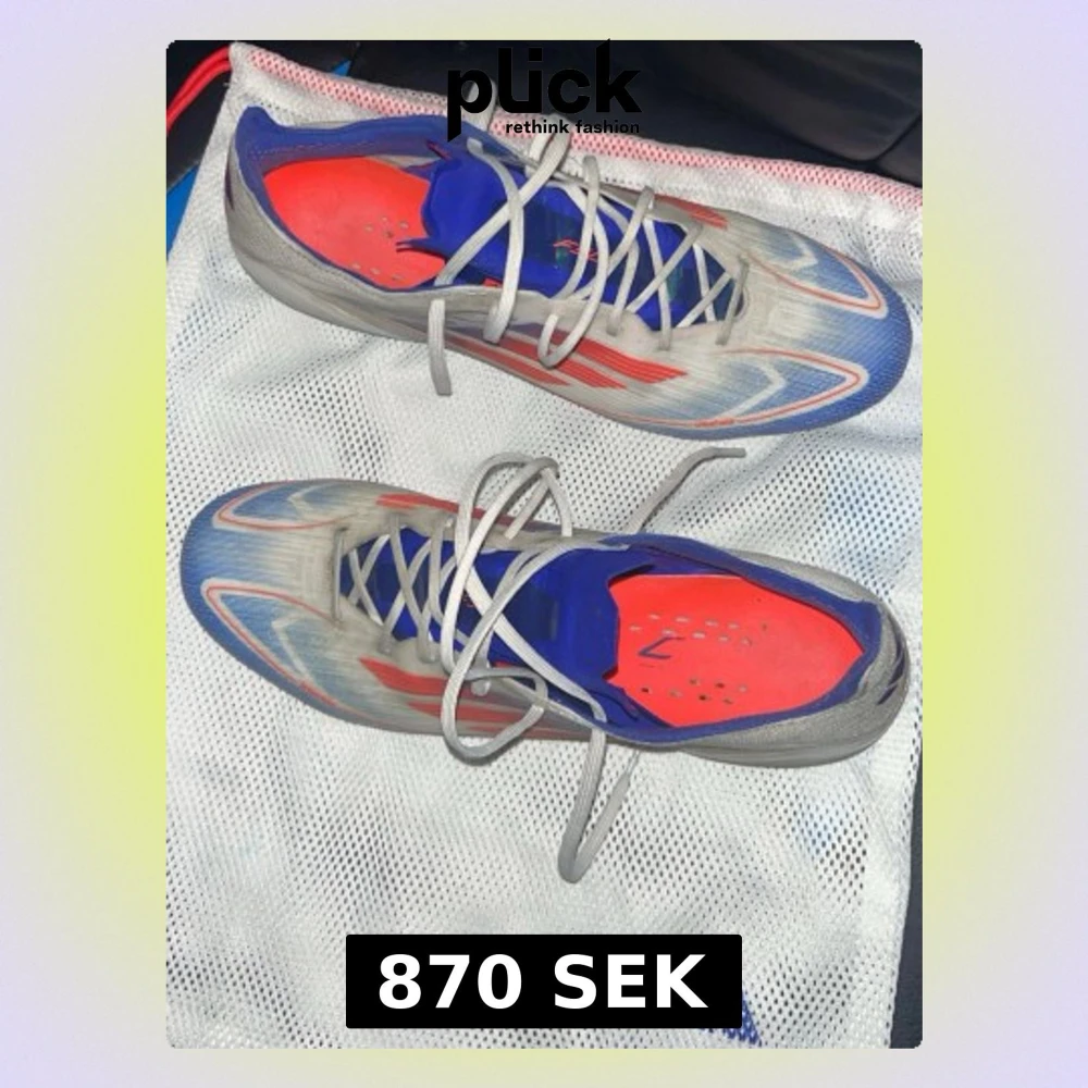 Säljer ett par Adidas F50 fotbollsskor med snygg design i blått, rött och vitt. Skorna har snörning, platt sula med dobbar och en sportig look. Ovandelen är i syntetmaterial och insidan är röd med ventilerande hål. Perfekt för dig som vill sticka ut på planen! Helt nya inte en ända skada på skorna
