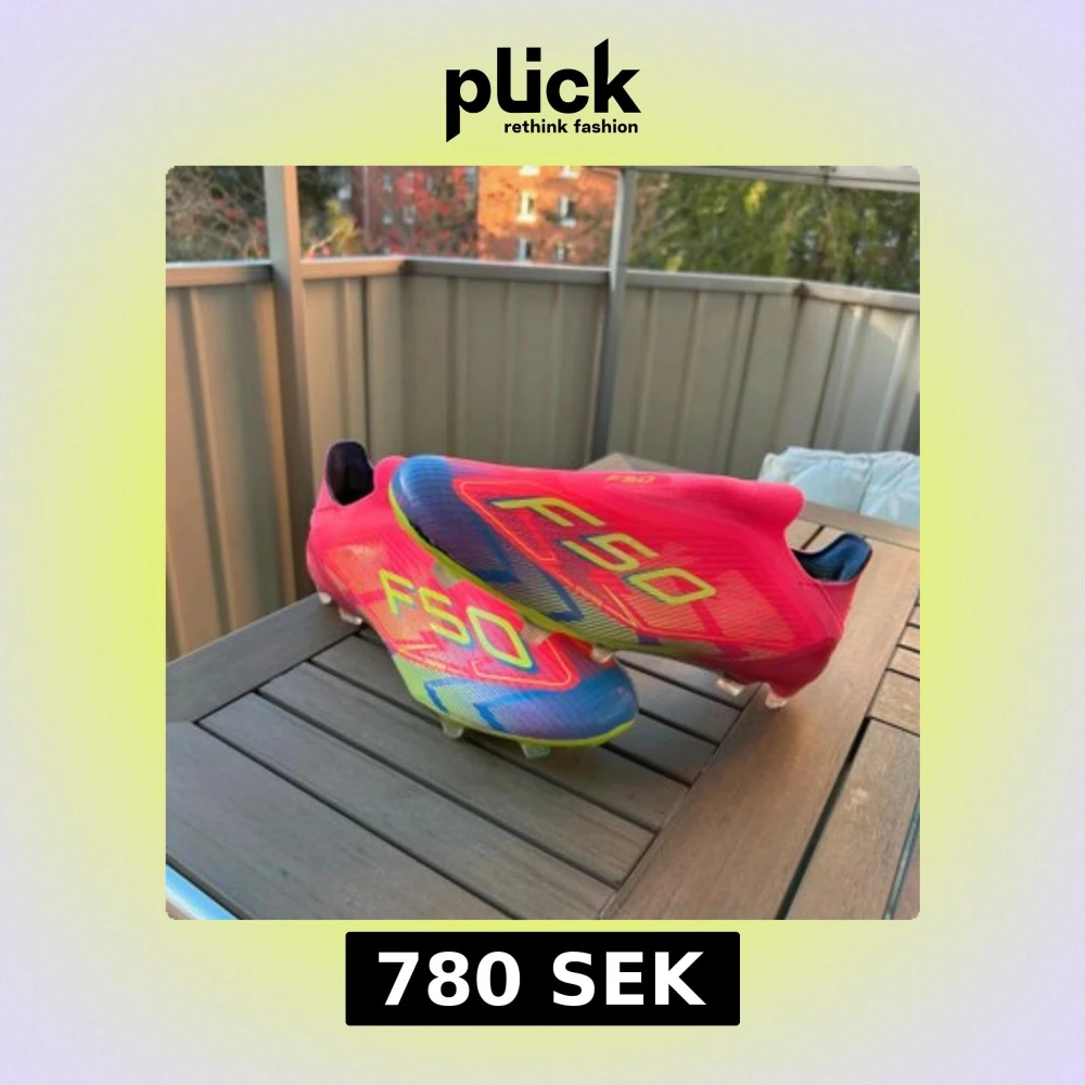 Säljer ett par Adidas F50 fotbollsskor i en riktigt fet neonrosa färg med gula och blå detaljer. Skorna har en strömlinjeformad design, låg profil och platt sula med dobbar för gräsplan. Materialet är lätt syntet och ovandelen har ett randigt mönster. Perfekt för dig som vill sticka ut på planen.