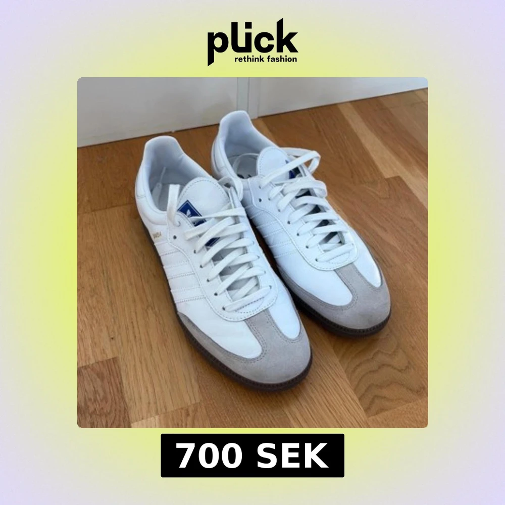 Säljer ett par klassiska Adidas Samba sneakers i vitt skinn med grå mockadetaljer och bruna gummisulor. Skorna har de ikoniska tre ränderna på sidan, blå logga på plösen och snörning framtill. Perfekta för dig som gillar retrostil och streetwear. Har använts 2 gånger och är impregnerade. Säljes pga brist på plats.