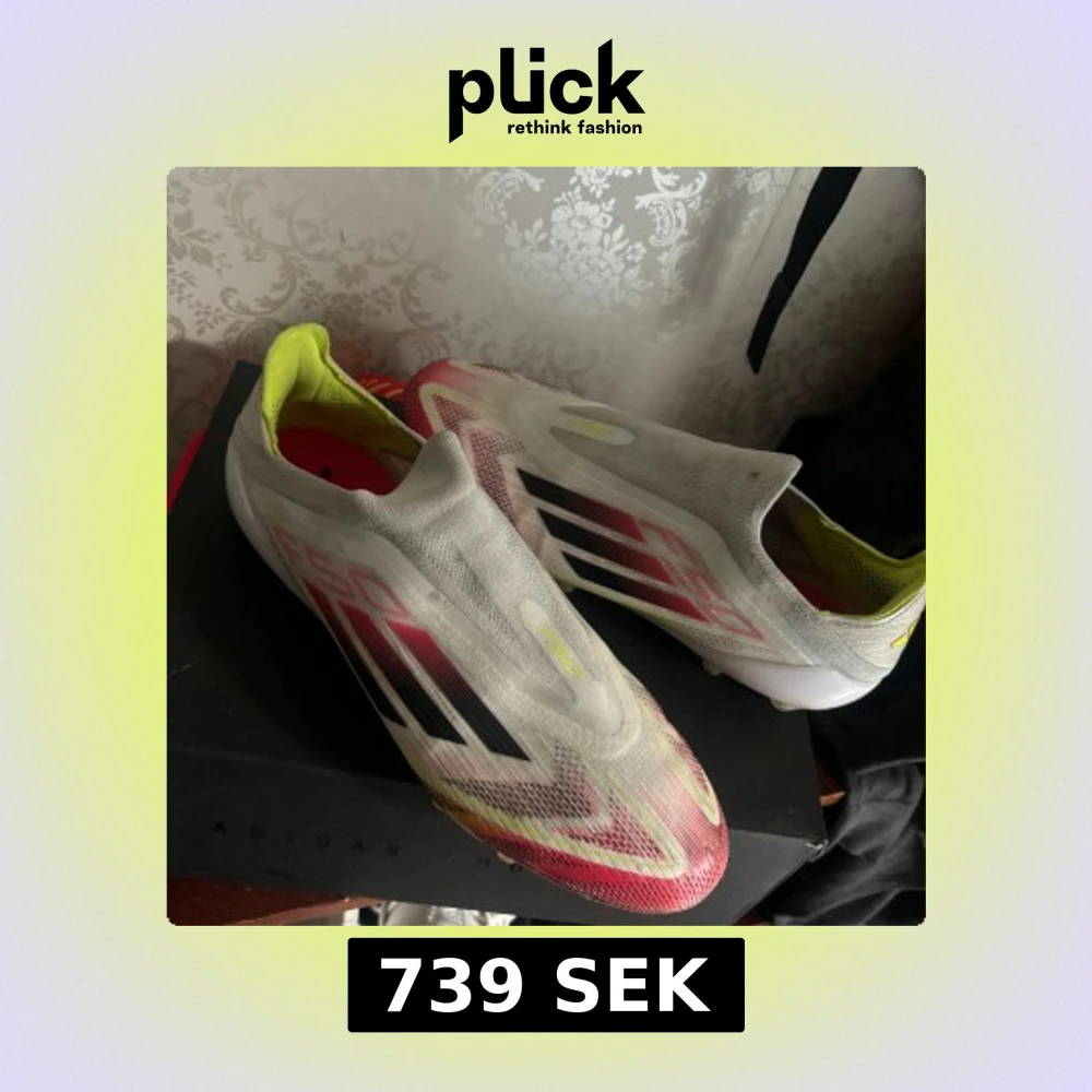 Snabba Adidas F50 fotbollsskor med en clean design i vitt, rött och svarta detaljer. Ovandelen är i lätt syntetmaterial och sulan har fasta dobbar för gräsplan. Insidan är neongul för extra edge. Perfekta för dig som vill sticka ut på planen.