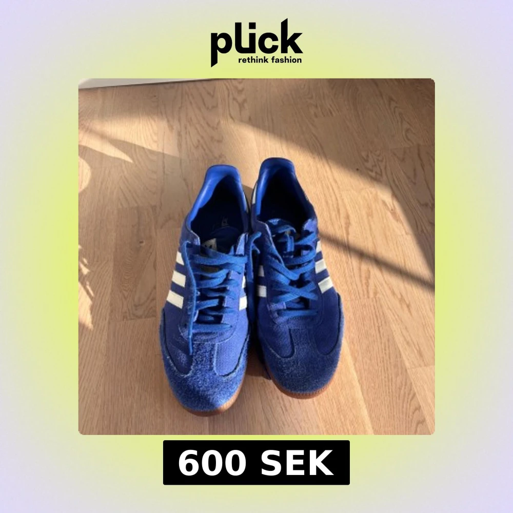Säljer ett par blå Adidas Samba sneakers med klassiska vita ränder och gummisula. Ovandelen är i mocka och skon har snörning. Perfekt för dig som gillar retrostil och vill sticka ut med färg. Ikonisk modell med guldfärgad Samba-text på sidan. OBS säljer skorna då dom va för små för mig