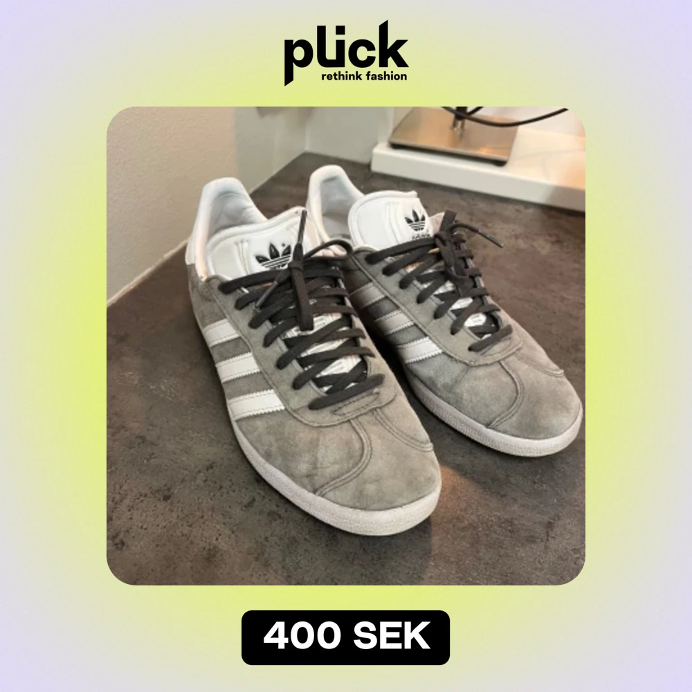 Ett par grå Adidas gazelle storlek 42, okej skick men lite sönder bak på sulan