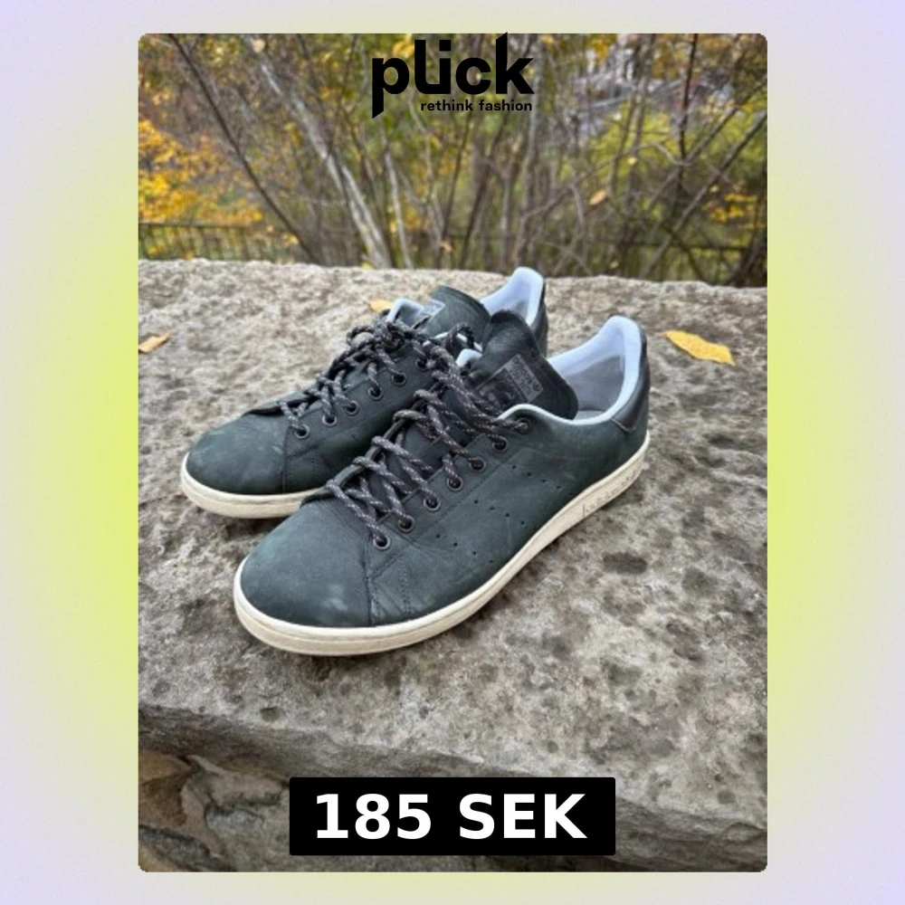 Säljer ett par Adidas Stan Smith sneakers i svart skinn med vita detaljer och svartvita snören. Klassisk låg modell med perforerade hål på sidan och vit sula. Perfekta för dig som gillar tidlös streetstil och vill ha något som funkar året runt.