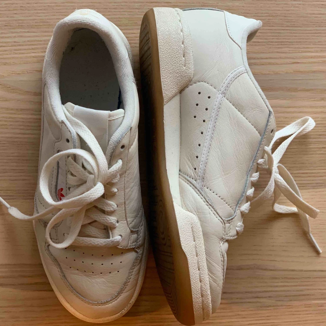 Använda en gång. Vita klassiska adidas sneakers i bra skick! Passar allt och är perfekta till vardagen och våren som kommer :)