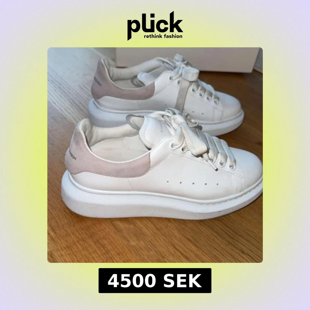 Säljer ett par ikoniska vita sneakers från Alexander McQueen med chunky sula och breda snören. Skorna har detaljer i ljusbeige mocka på hälen och är tillverkade i skinn. I storlek 37.