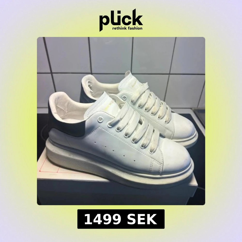 Säljer ett par klassiska vita sneakers från Alexander McQueen med chunky plattformssula och svart hälparti. Skorna har rund tå, snörning och är tillverkade i slätt skinn med guldfärgad logga på plösen. Perfekta för dig som gillar stilrena och trendiga sneakers.