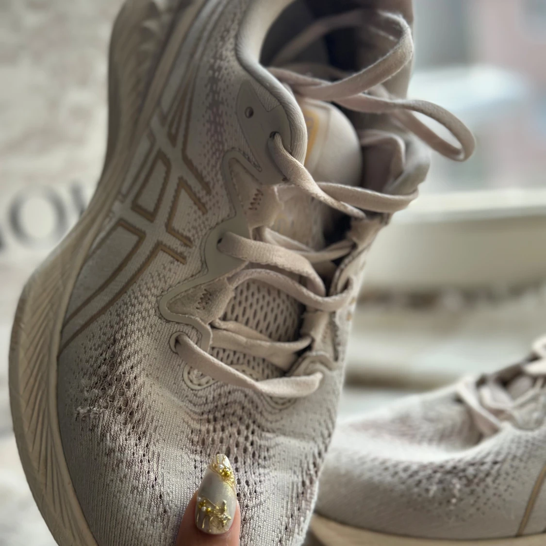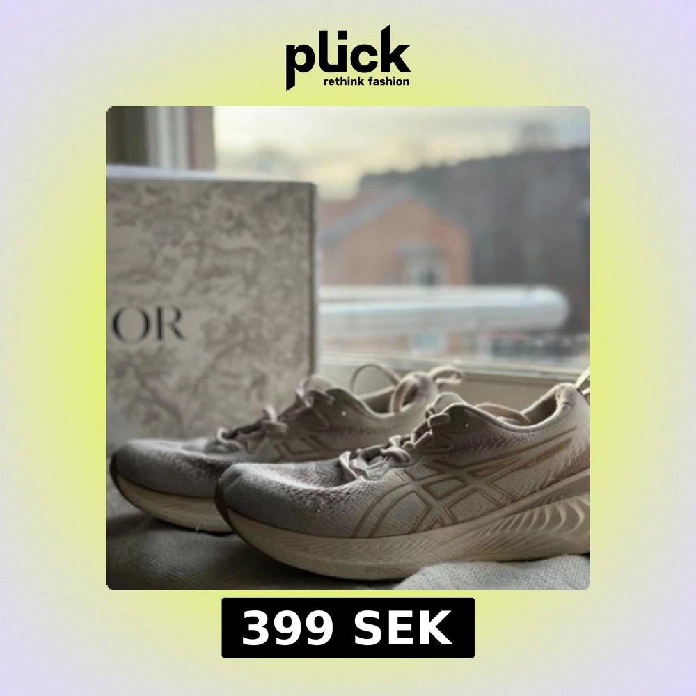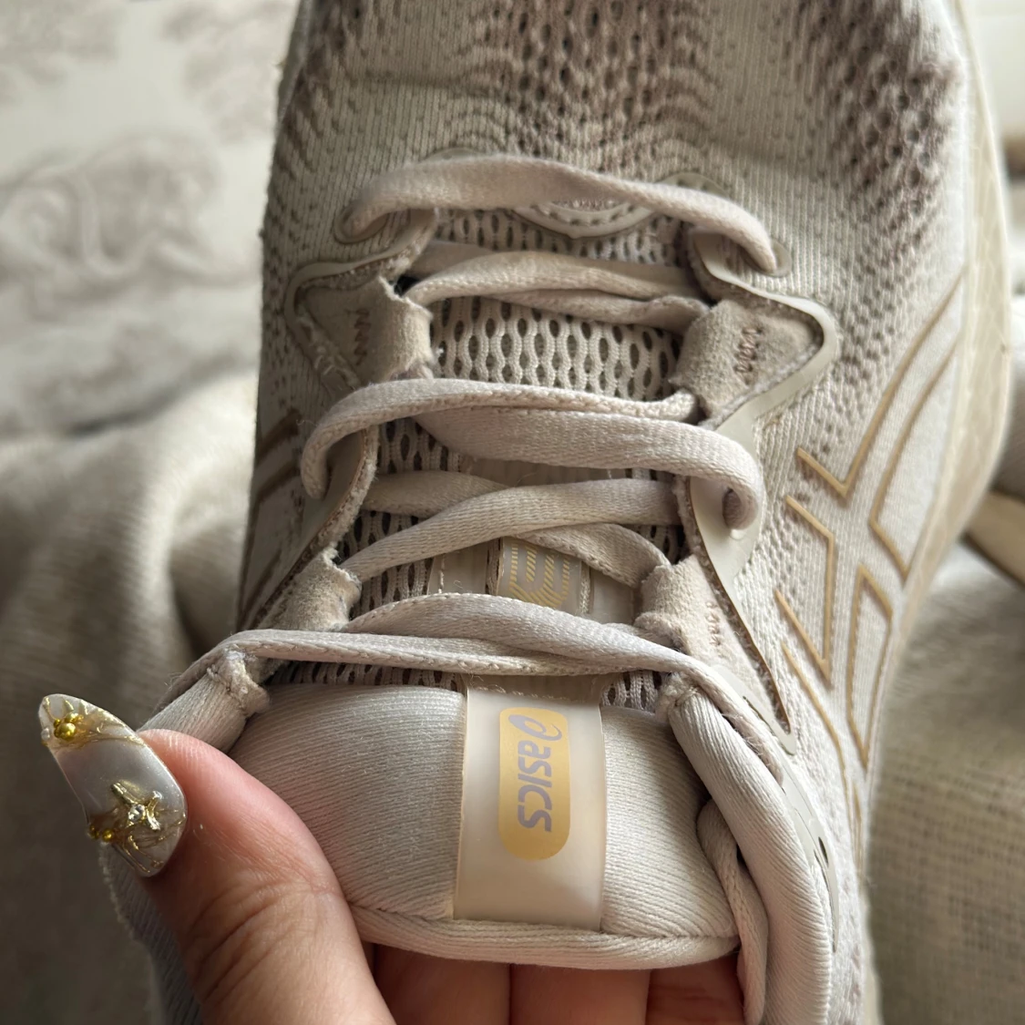 Säljer ett par snygga Asics sneakers i beige med klassisk logga på sidan. Skorna har mesh-ovandel för extra andningsförmåga och en riktigt bekväm sula. Perfekta för dig som gillar stilrena och sportiga skor med snörning och rund tå.