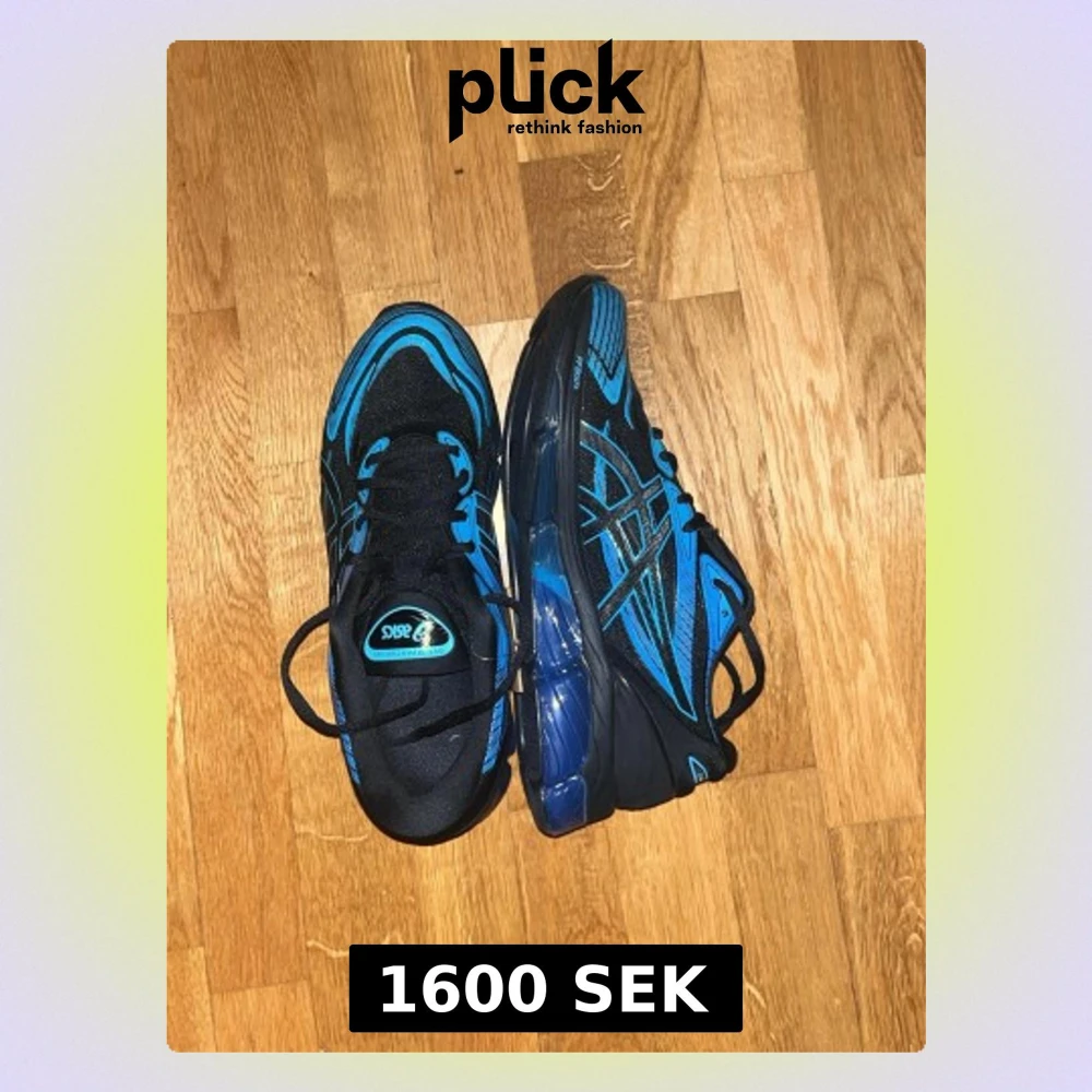 Säljer ett par snygga ASICS sneakers i svart och blått med coola detaljer och mönster på sidan. Skorna har snörning och en platt sula med extra dämpning, perfekt för dig som gillar sportig stil. Materialet är syntet och mesh för bra andning.