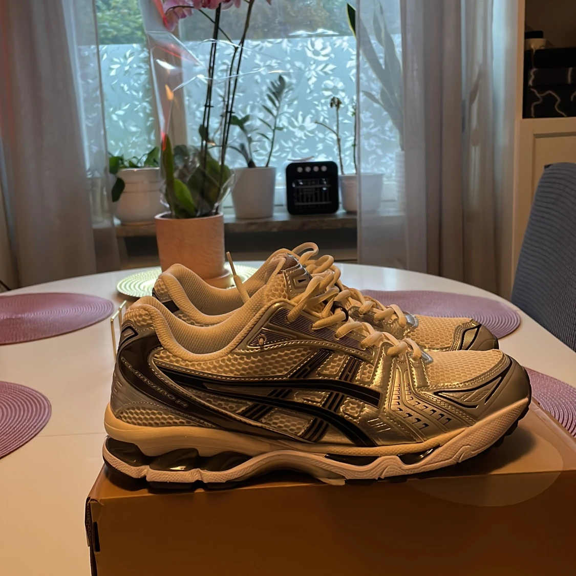 Säljer ett par Asics Gel-Kayano 14 sneakers i vit och silver med svarta detaljer. Skorna har mesh-överdel, syntetpaneler och snörning. Ikonisk retrodesign med rund tå och platt sula, perfekt för dig som gillar streetwear och coola detaljer.