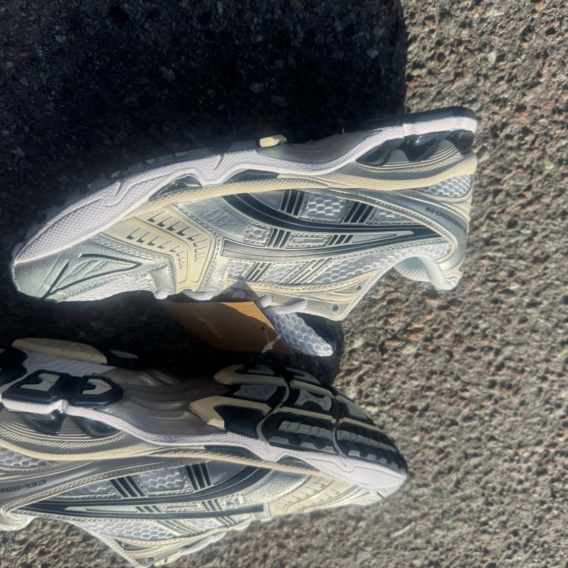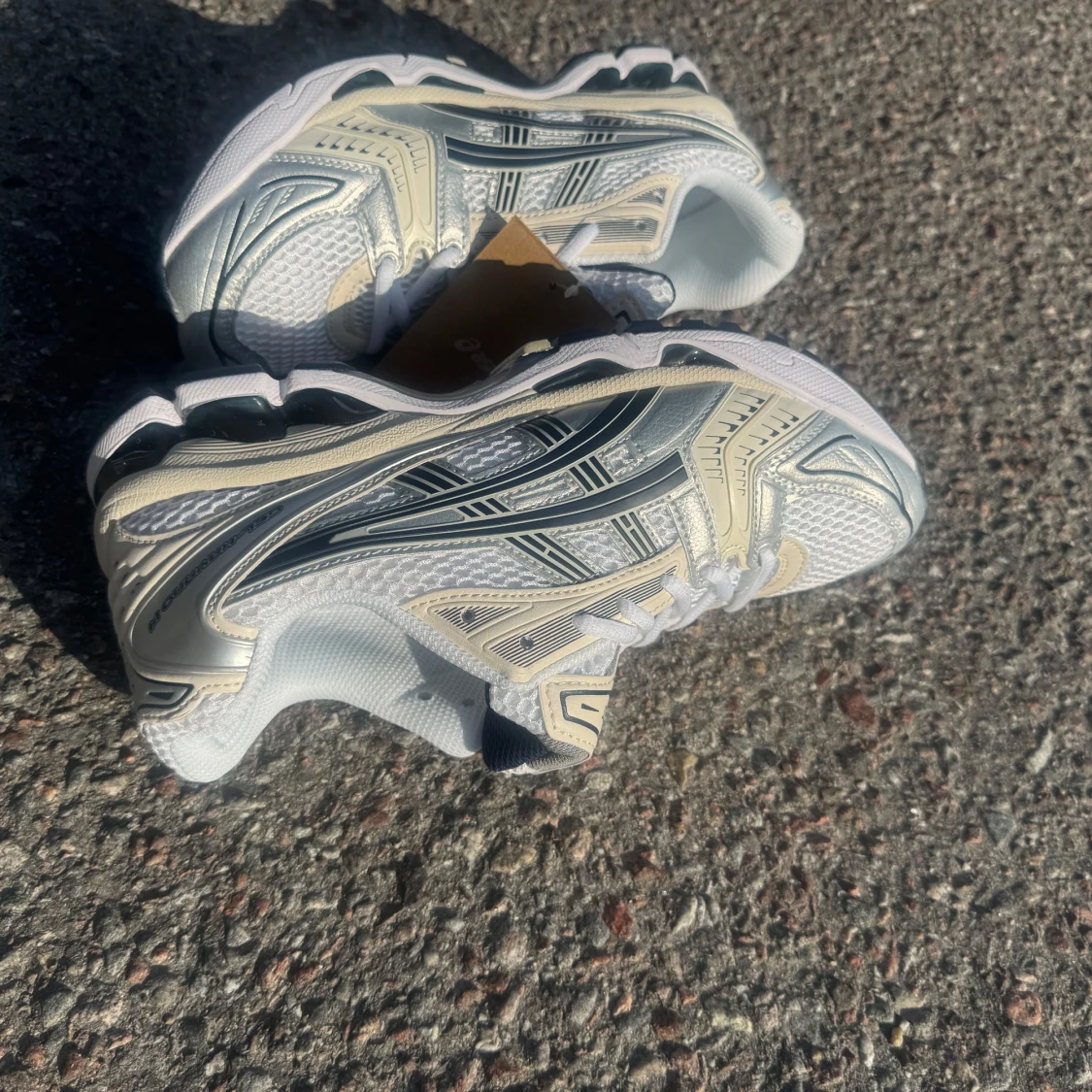 Snygga Asics sneakers i vitt och beige med svarta detaljer. Ovandelen är i mesh och syntet för bra andningsförmåga och komfort. Klassisk snörning och sportig design med rund tå och platt sula. Perfekta för dig som gillar retrovibbar och streetstyle.