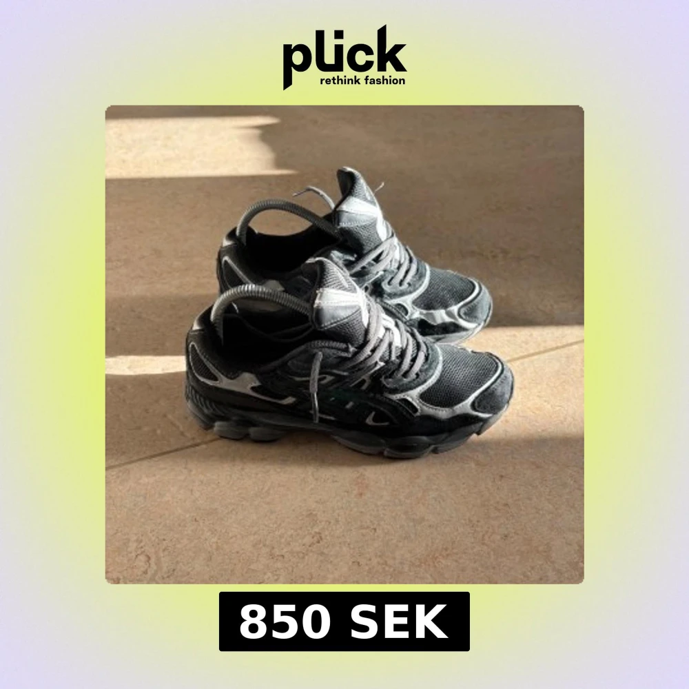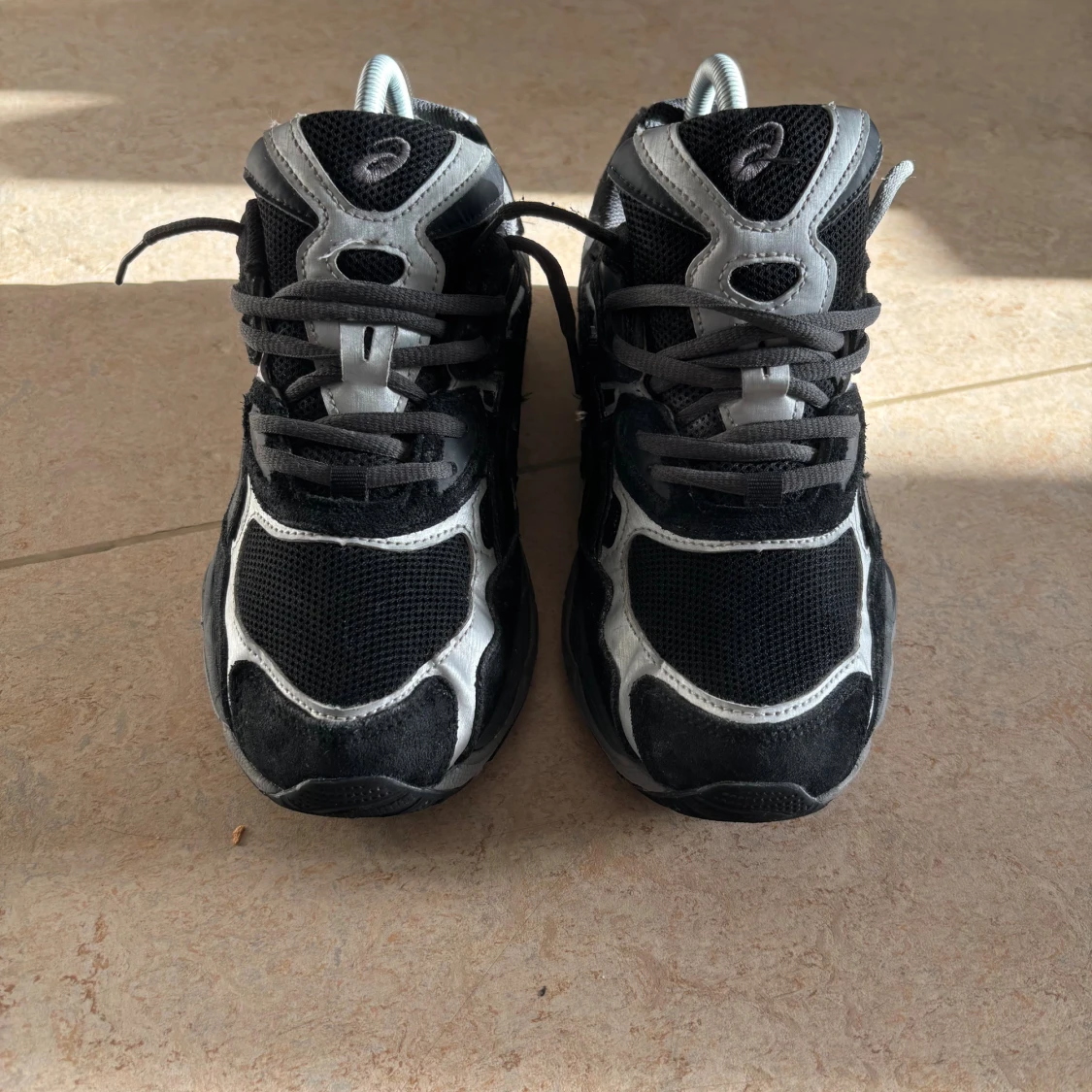 Säljer ett par svarta Asics sneakers med grå och silverfärgade detaljer. Skorna har mesh- och mockapaneler, snörning och en chunky sula som ger en sportig vibe.