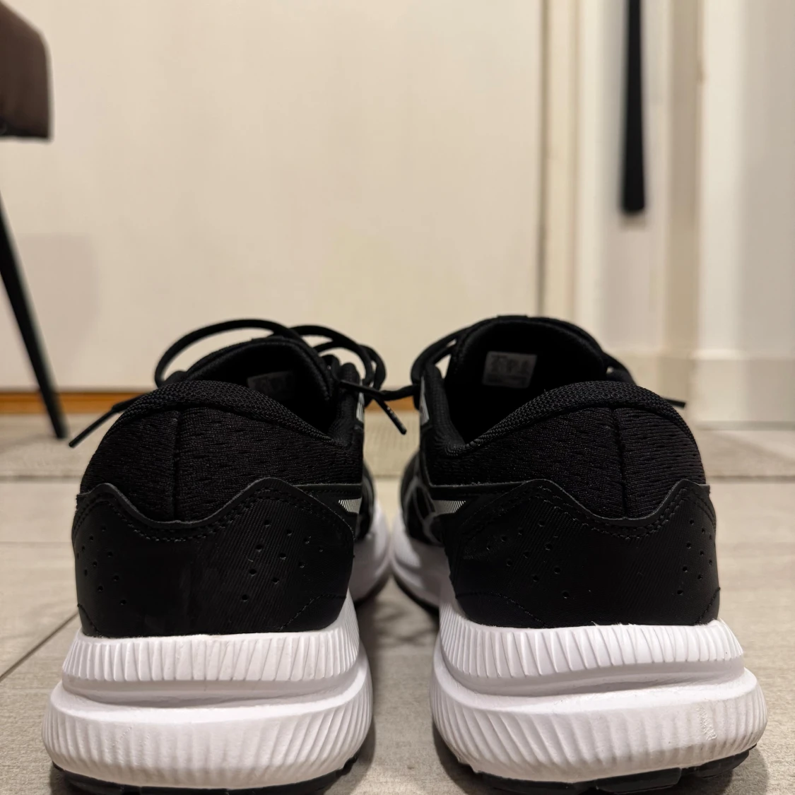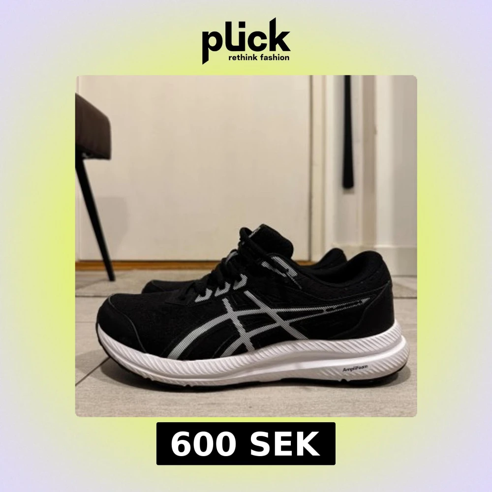 Snygga svarta Asics sneakers med klassiska vita detaljer och logga på sidan. Skorna har en bekväm och dämpad vit sula med AmpliFoam-teknologi, mesh-ovandel för bra andningsförmåga och snörning för perfekt passform. Perfekta för dig som gillar sportig stil. Nypris 1000kr helt nya