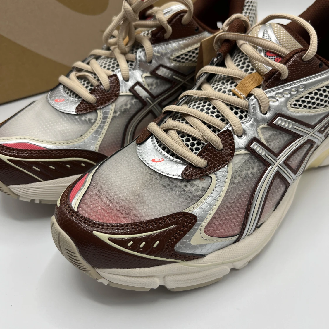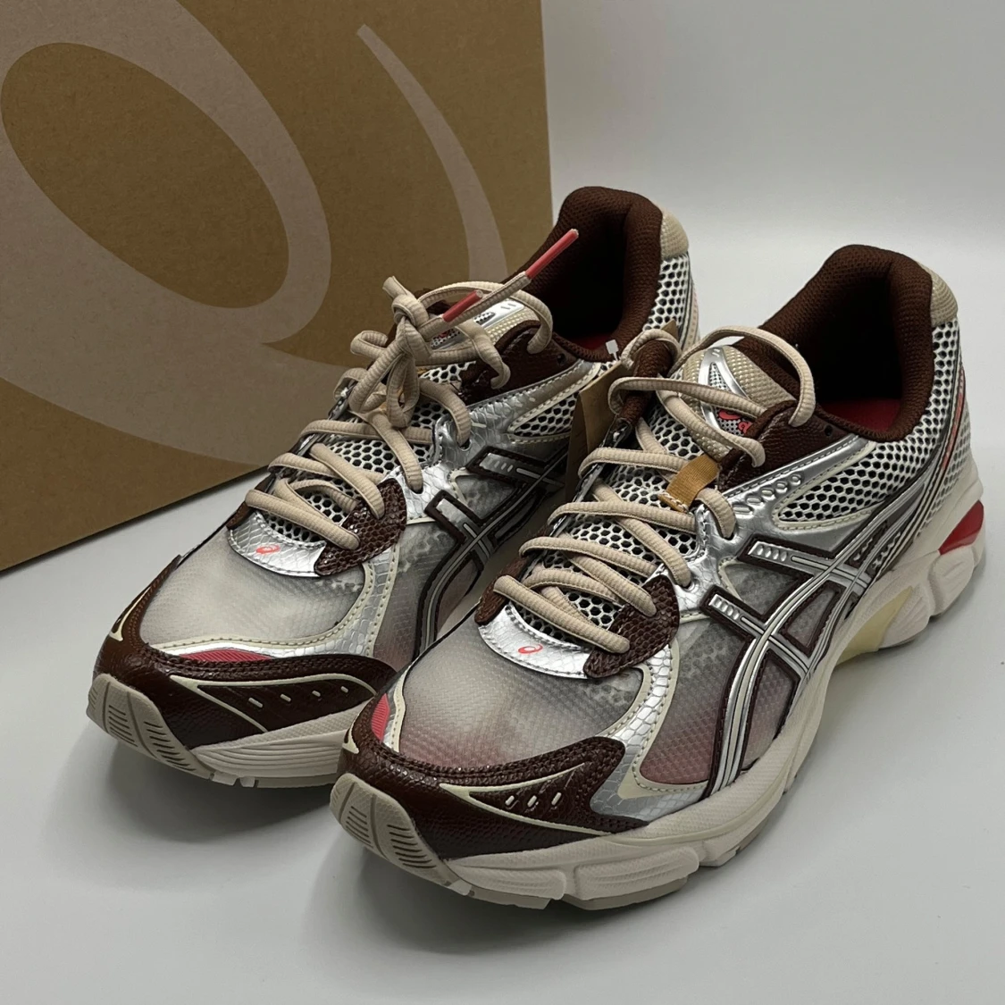 Snygga Asics GT-2000 sneakers i en kombination av silver, brunt och vitt. Skorna har snörning och en bekväm sula med bra grepp. Perfekta för löpning eller vardagsbruk.