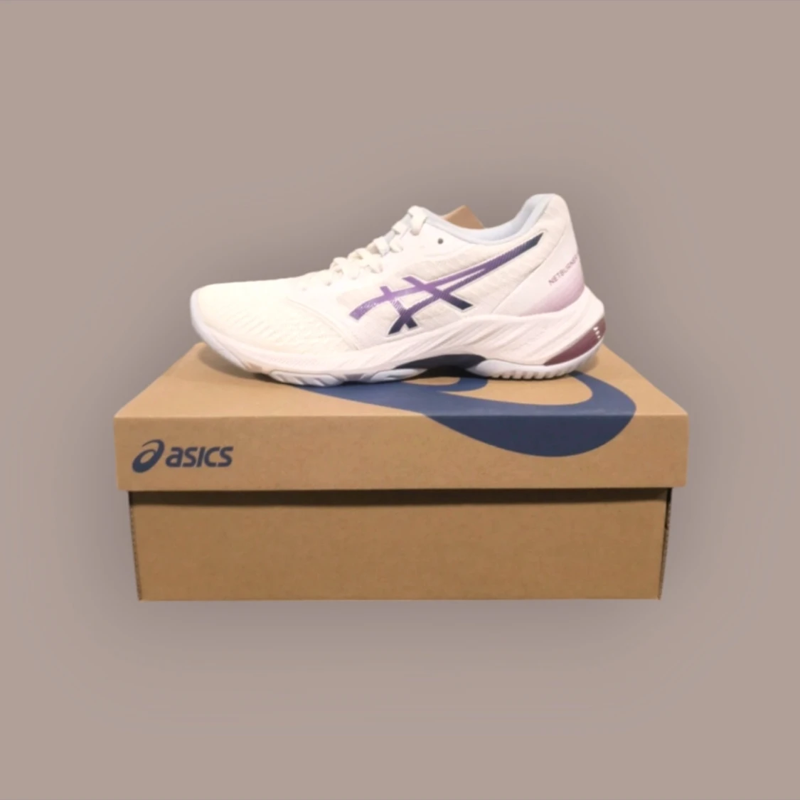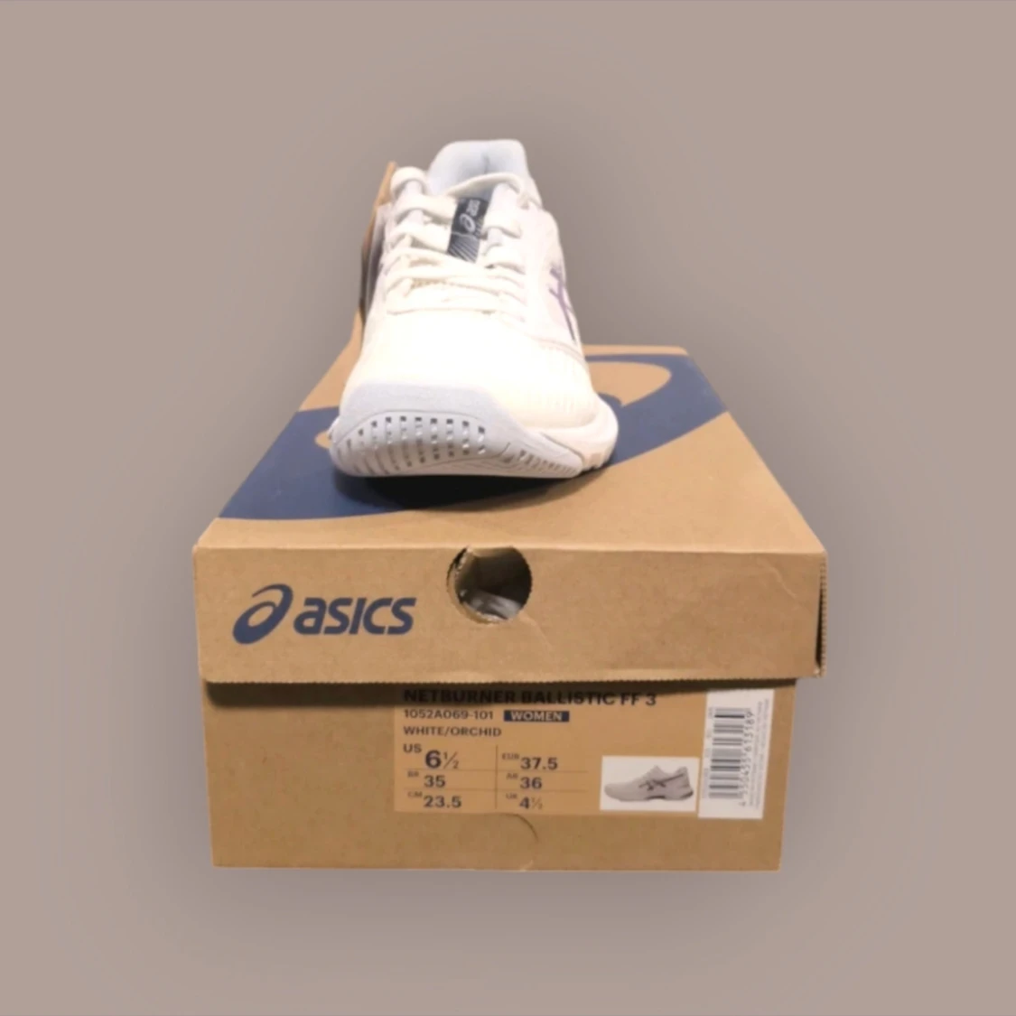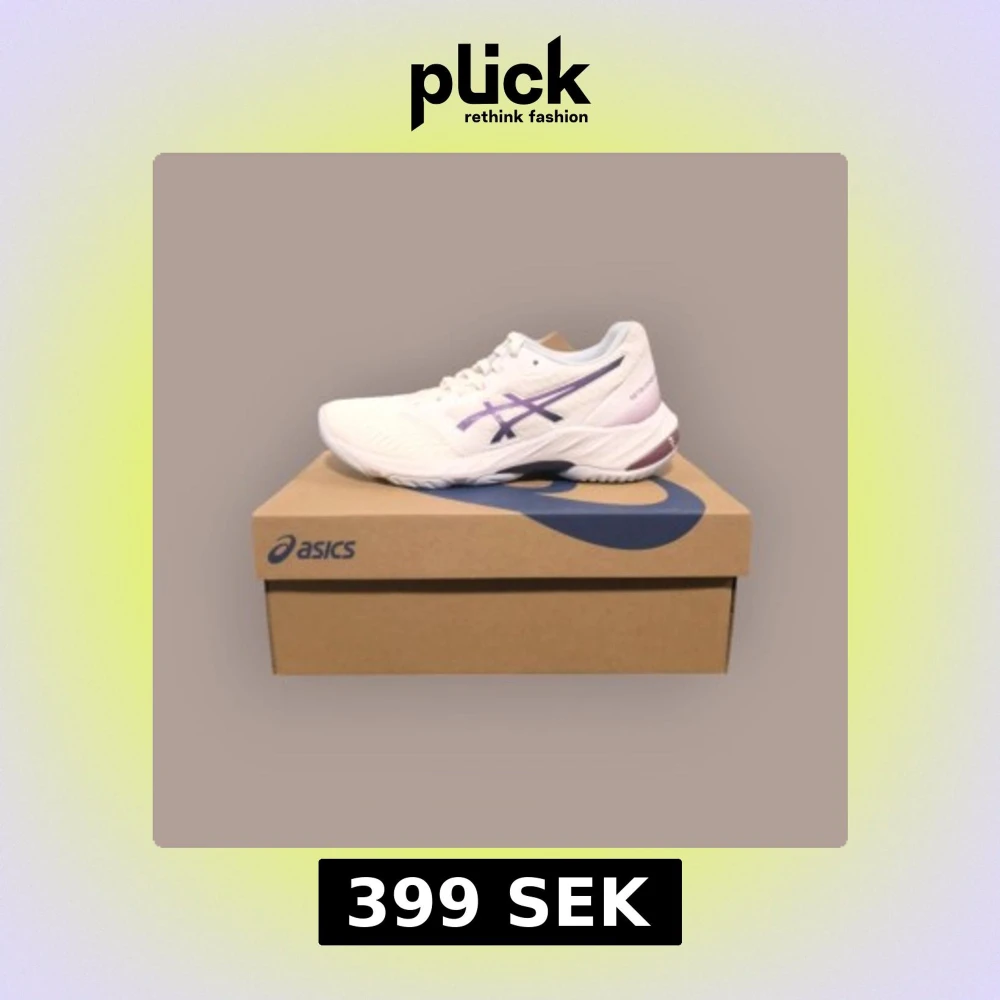 Säljer ett par vita Asics sneakers med lila detaljer. Skorna har snörning och är perfekta för träning eller vardagsbruk. De kommer i originalkartong. Oanvända, nypris 1499kr