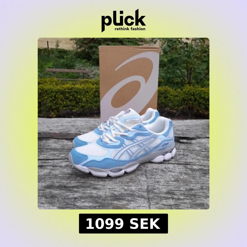 Snygga Asics Gel sneakers i vitt och ljusblått med grå detaljer. Ovandelen är i mesh och syntet med klassiska Asics-ränder på sidorna. Skorna har snörning, rund tå och en chunky vit sula med gel-dämpning för extra komfort. Perfekta för dig som gillar sportig stil.