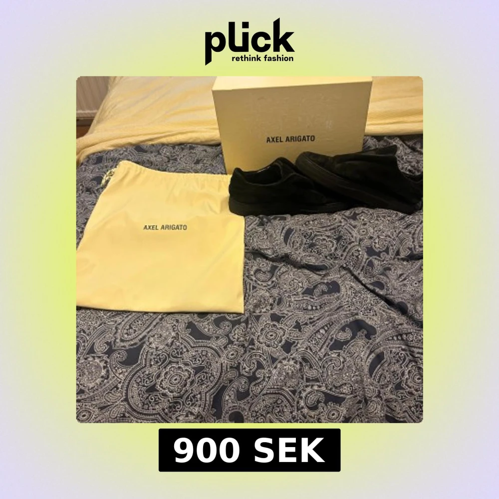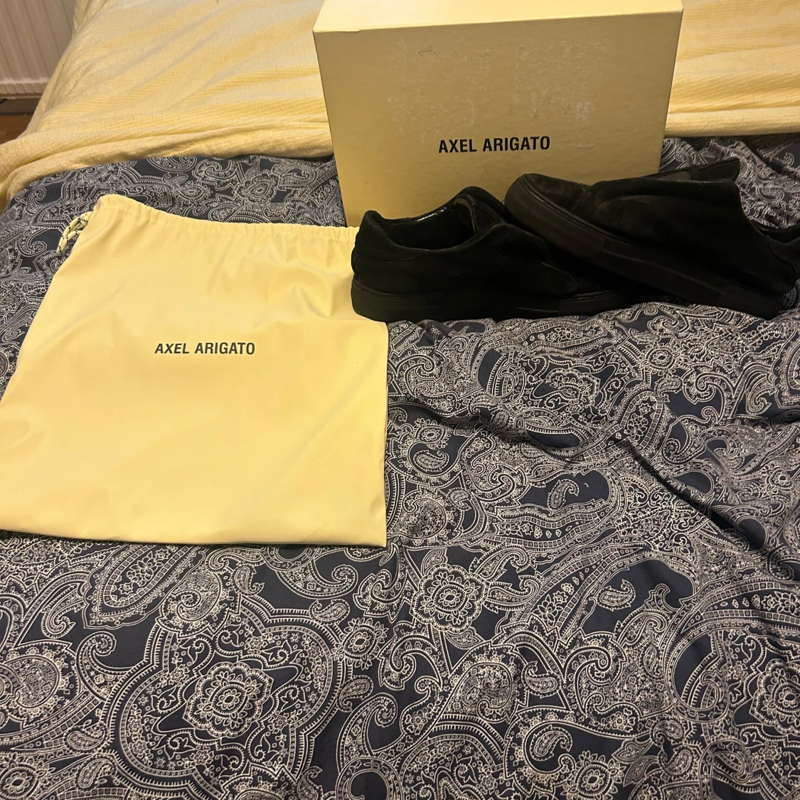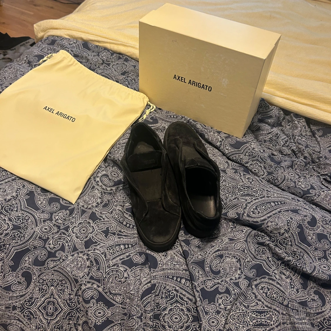 Säljer ett par svarta sneakers från Axel Arigato i mocka med stilren design och platt sula. Skorna har en låg profil och kommer med originalkartong och dustbag. Perfekta för dig som gillar minimalistisk och clean stil.