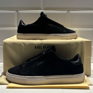 Svarta sneakers från Axel Arigato - Säljer ett par svarta sneakers från Axel Arigato med klassisk rund tå och platt vit sula. Skorna är tillverkade i mocka och har en stilren design utan synliga snörningar. Perfekt för dig som gillar minimalistisk och modern stil.