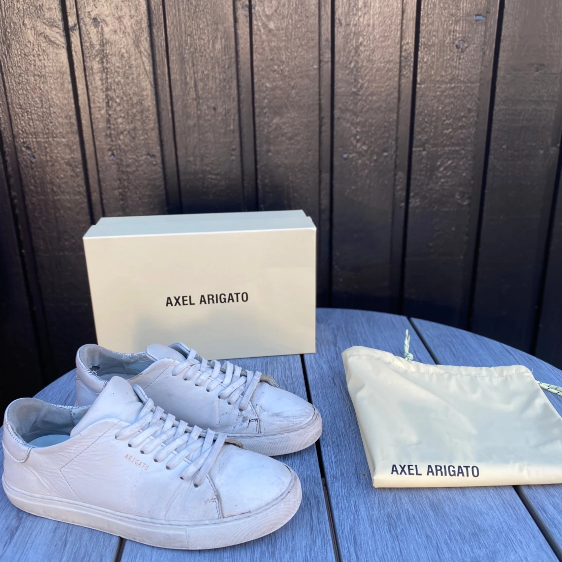 Säljer ett par vita Axel arigato clean 90 i storlek 41. Säljes pga för små! Säljes i befintligt skick! Box och dustbag medföljes! Nypris 2700kr Mitt pris 399kr
