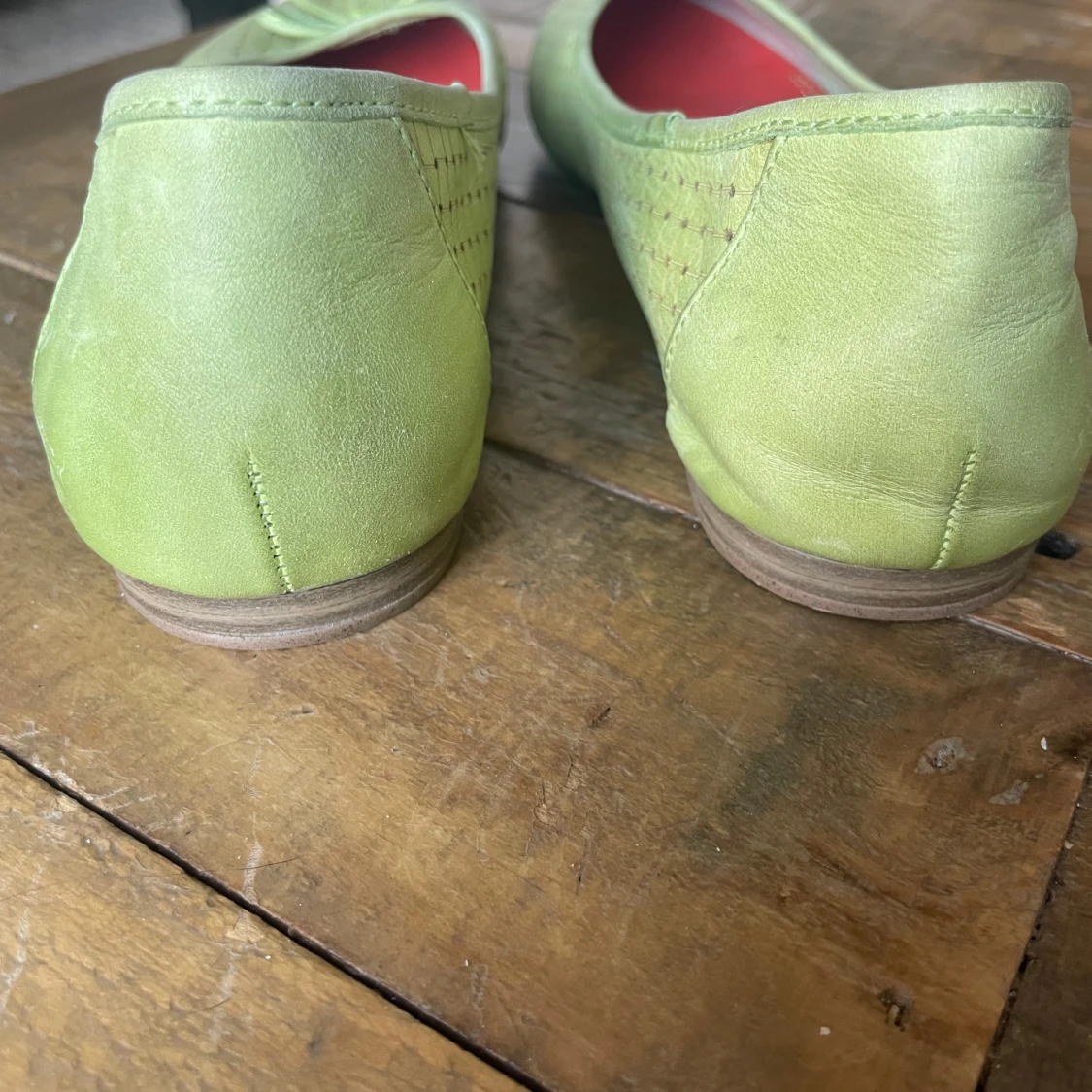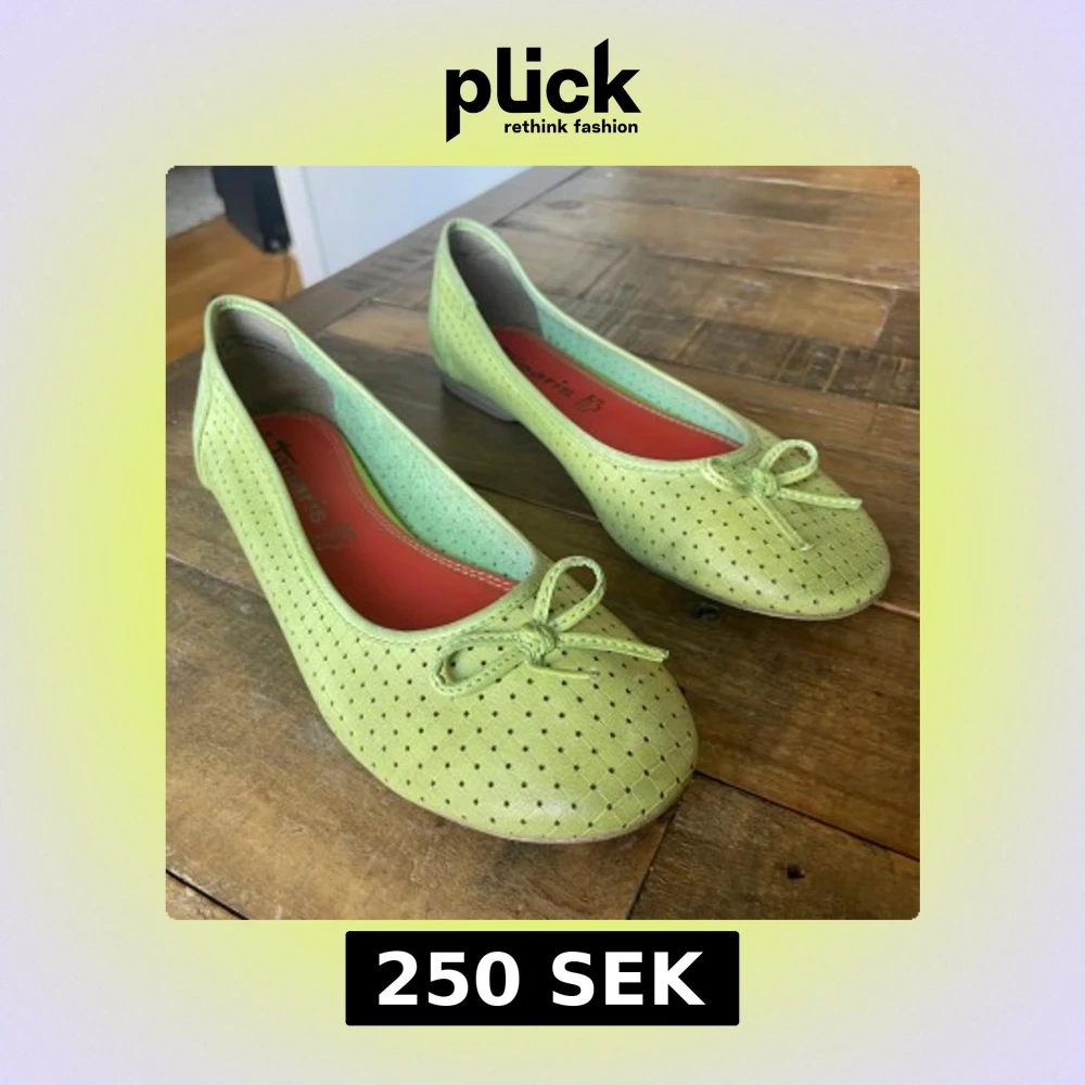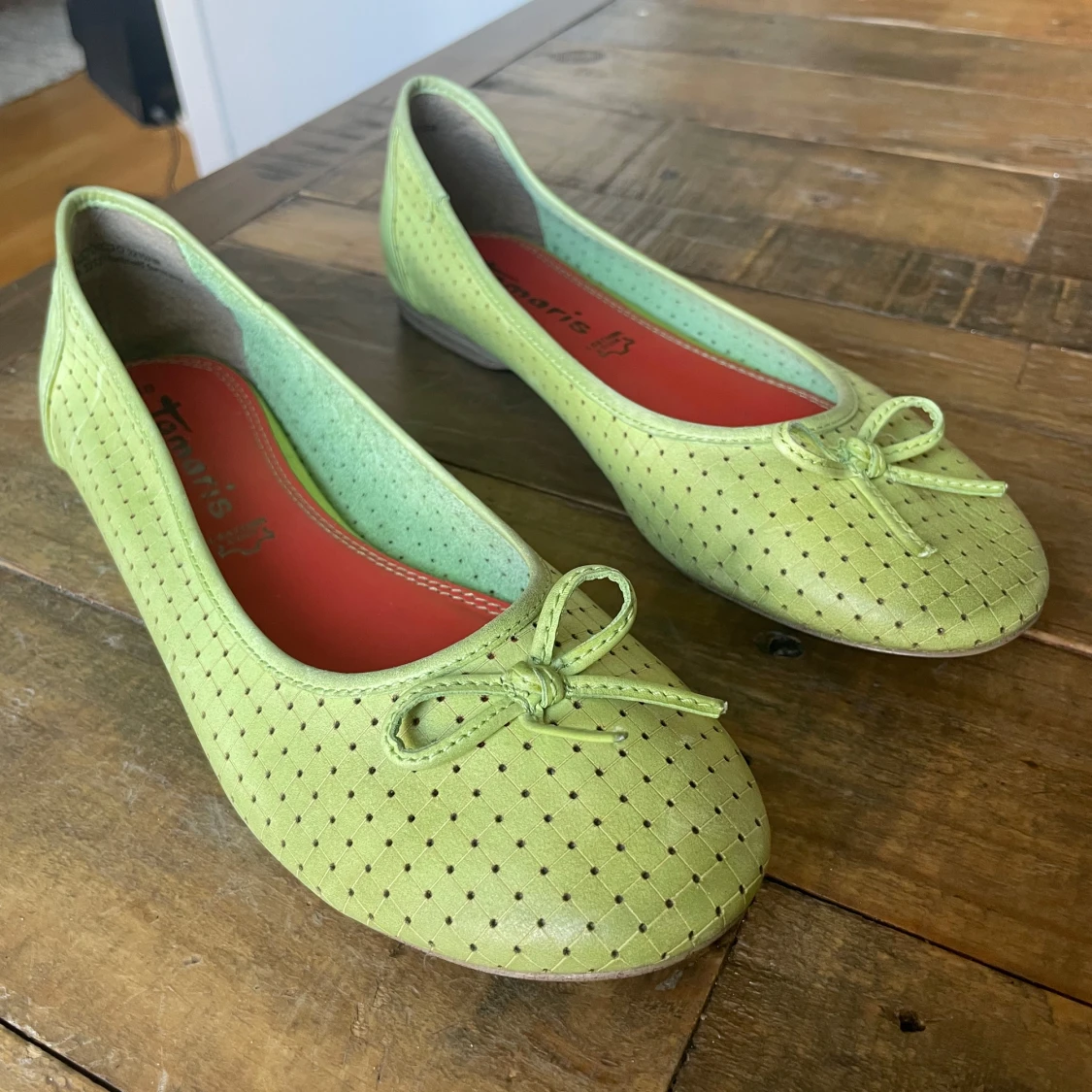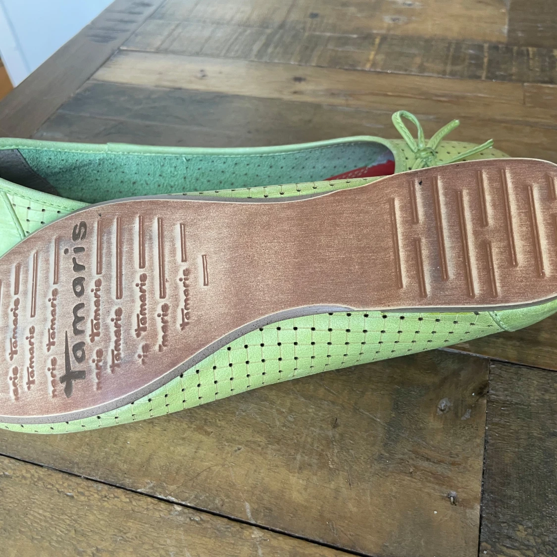 Snygga ljusgröna ballerinaskor från Tamaris med små hål i mönstret och en söt rosett framtill. Skorna har rund tå och platt sula, samt röd innersula som kontrast. För små,så toppenskick.