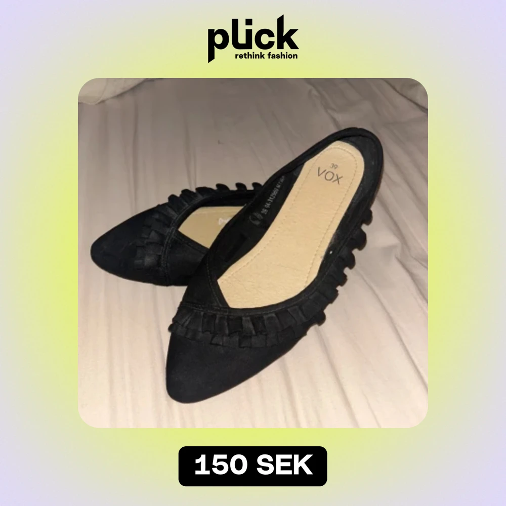Säljer ett par ballerinaskor som är oanvända! Superfin sko som är spetsig och har volang på. Storlek 39!