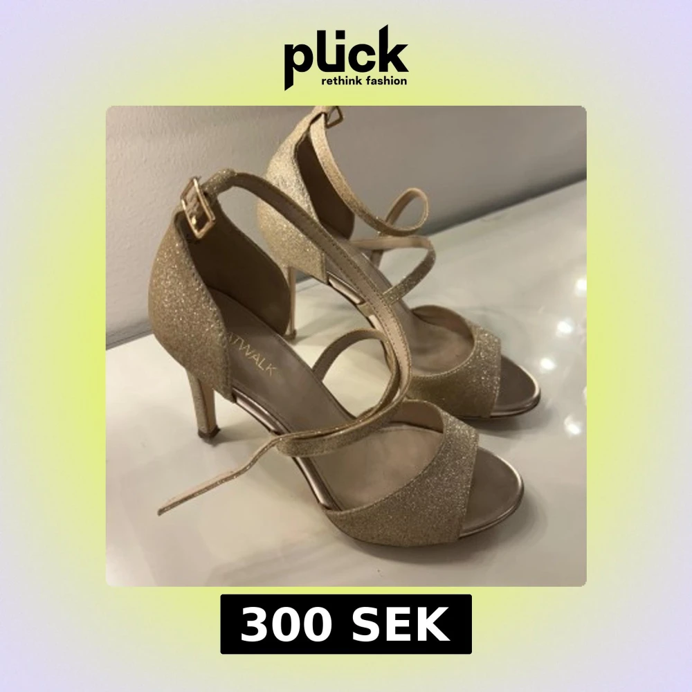 Säljer ett par glittriga Klackskor i guld från Catwalk med öppen tå och smal klack. Skorna har justerbart spänne vid ankeln och breda remmar över foten. Använda ett fåtal gånger, dom är lite smutsiga under skon alltså på sulan.🌸💕