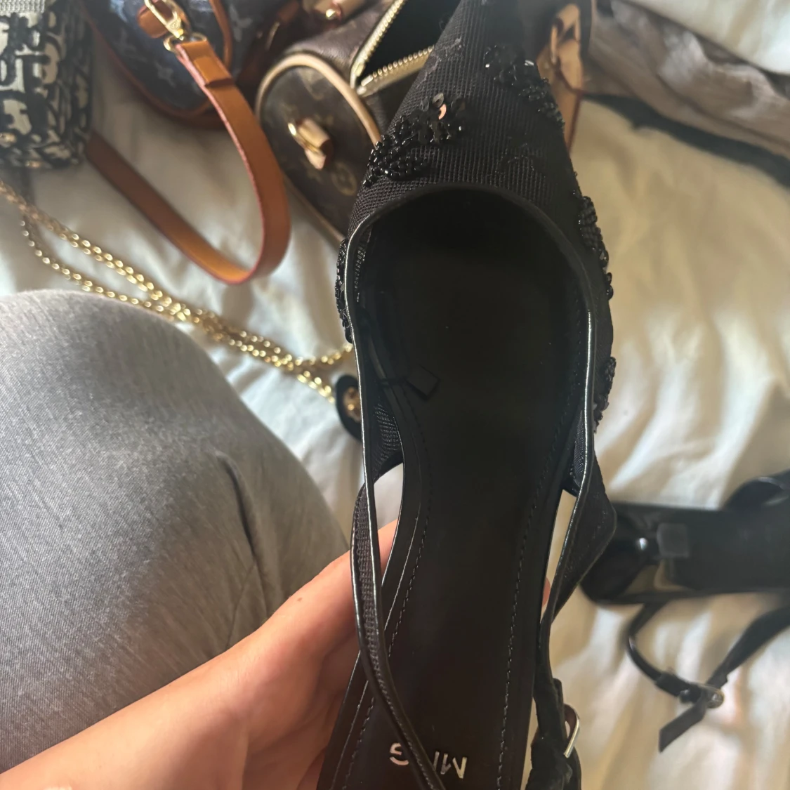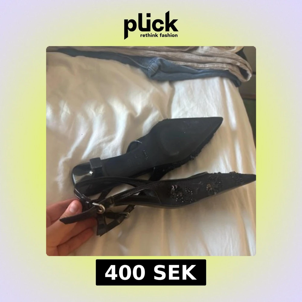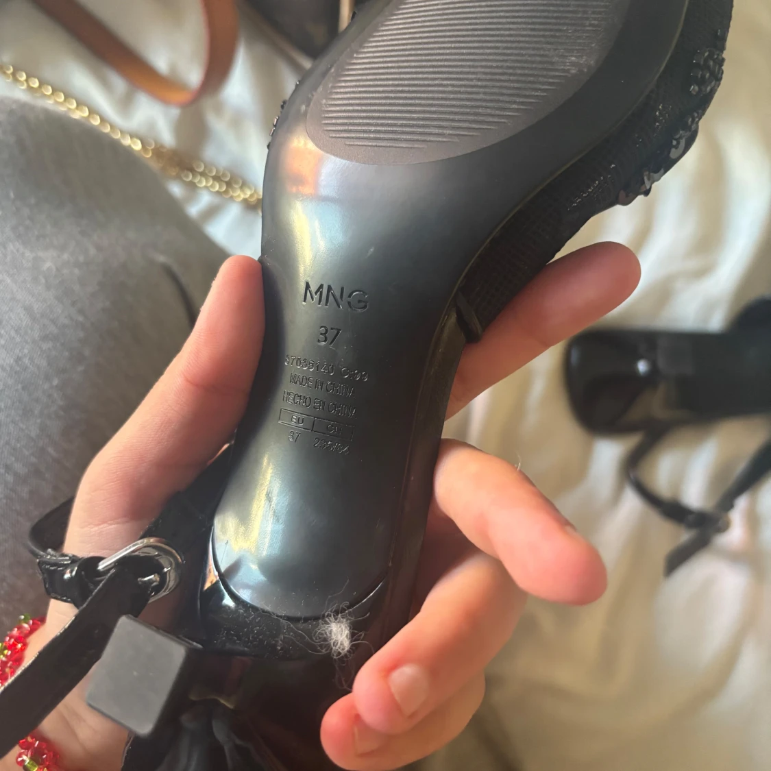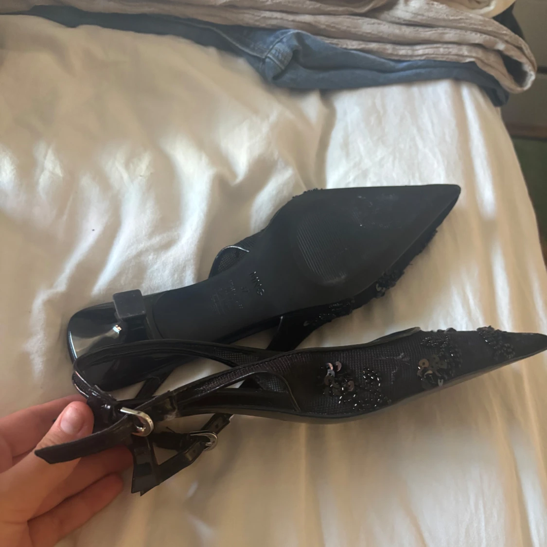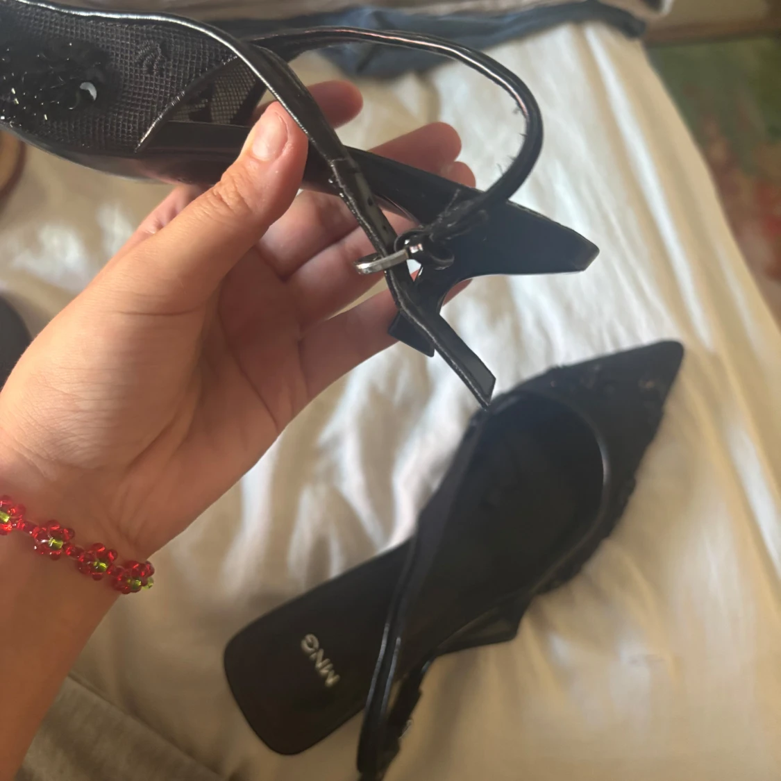 Svarta pumps från MNG med spetsig tå och låg klack. Skorna har snygga paljett- och pärldetaljer på ovandelen samt smal rem med spänne runt hälen. Materialet är syntet och textil, vilket ger en cool och elegant look.