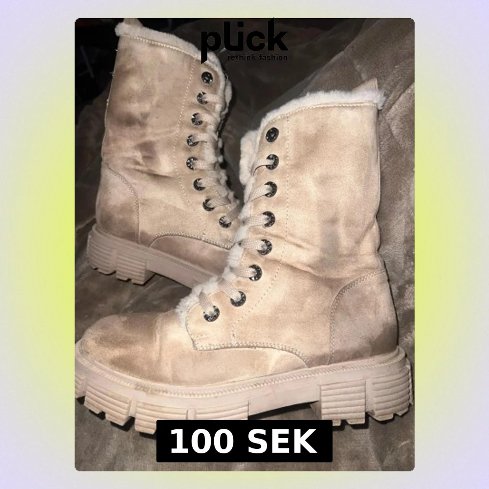 Chunky beige boots i mockaliknande material med grov sula och snörning framtill. Skorna har dragkedja på sidan och är fodrade med mjukt, ljust foder för extra värme. Perfekta för kyligare dagar och ger en cool vibe till din outfit.