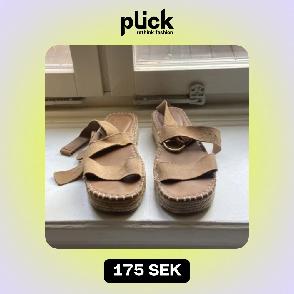 Säljer ett par snygga och bekväma sandaler från Zara i storlek 38. De är i en fin beige färg med en stilren design. Sandalerna har en platåsula med flätad detalj och justerbara remmar i mocka med guldfärgade spännen. Perfekta för sommaren!
