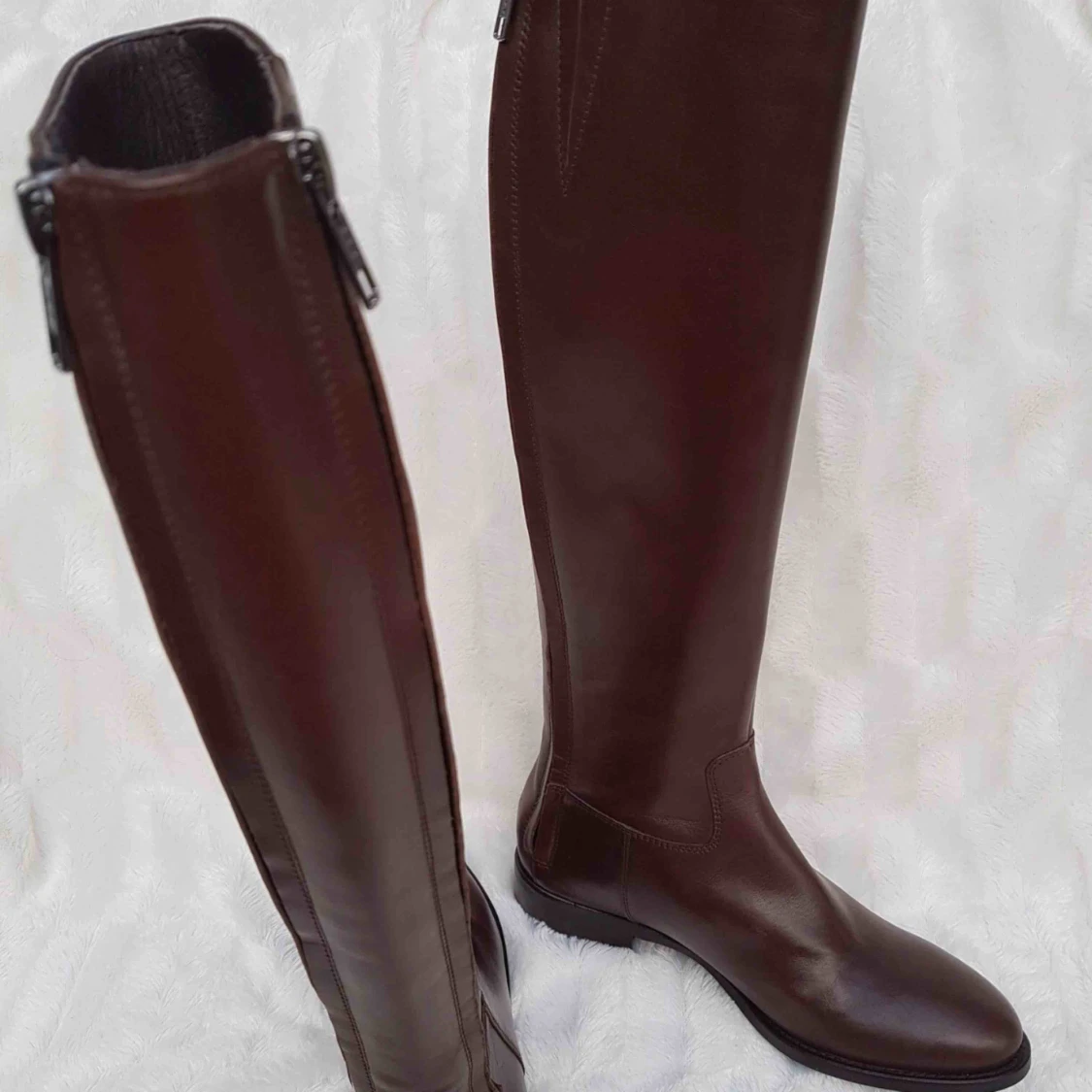 Hög skinnstövel i klassisk design med smalt skaft. Brun Billi Bi Copenhagen stövlar i mycket fin kvalité. Klassiskt vacker modell. Skafthöjd ca 40 cm Skaftbredd:16 x2 cm Storlek: 37 Oanvänt Helt Nya! Nytt pris runt 2799 SEK Två dragkedja på baksidan