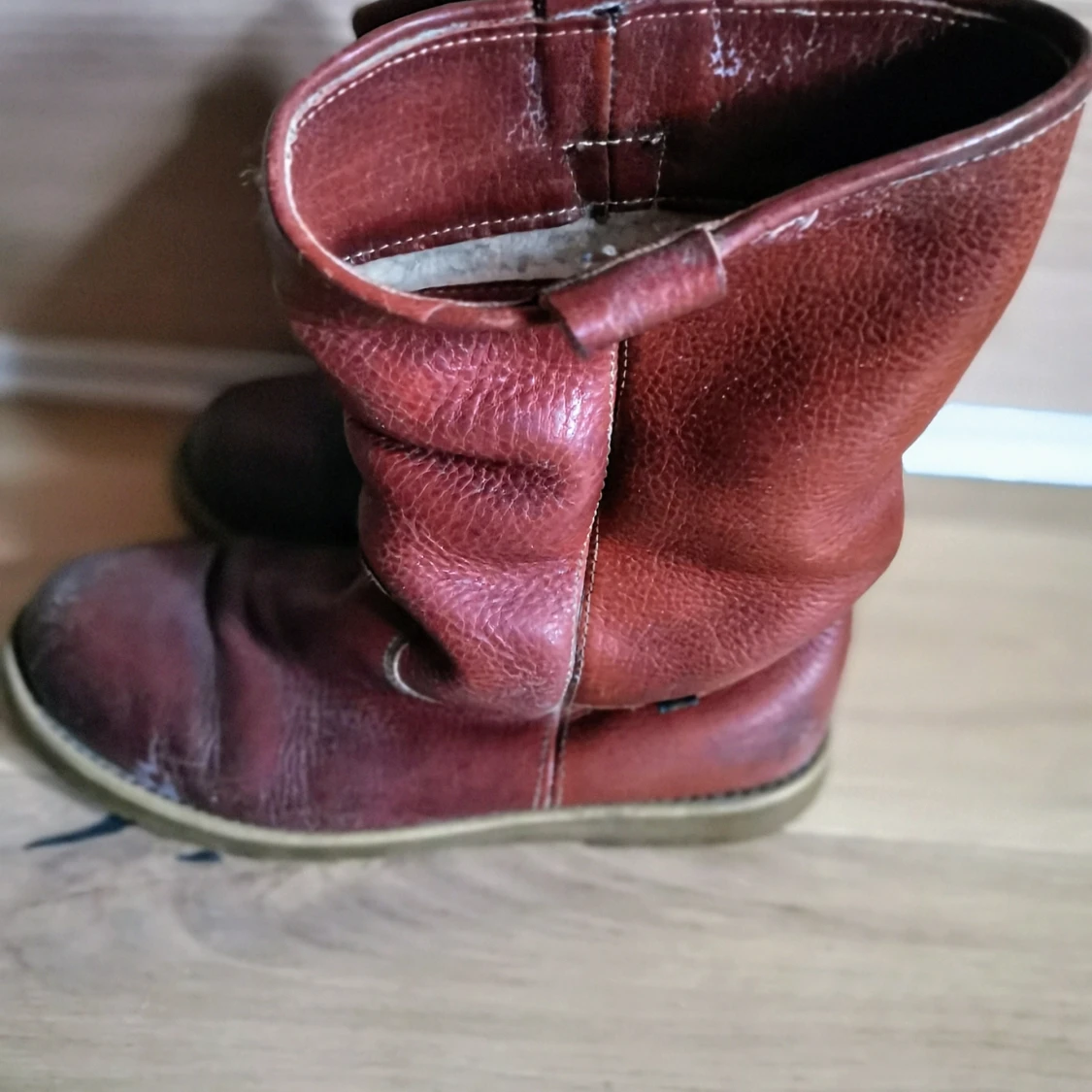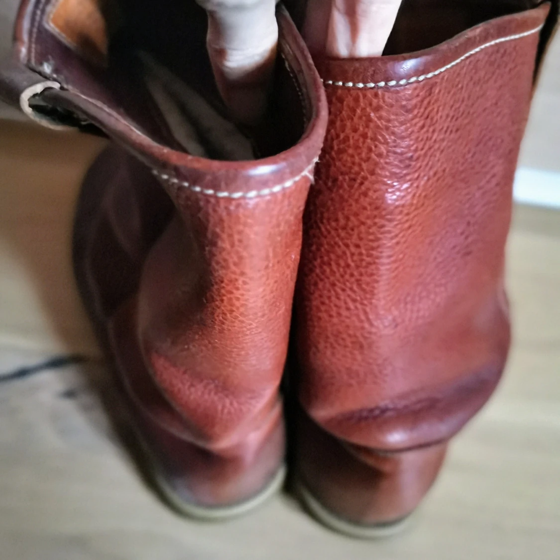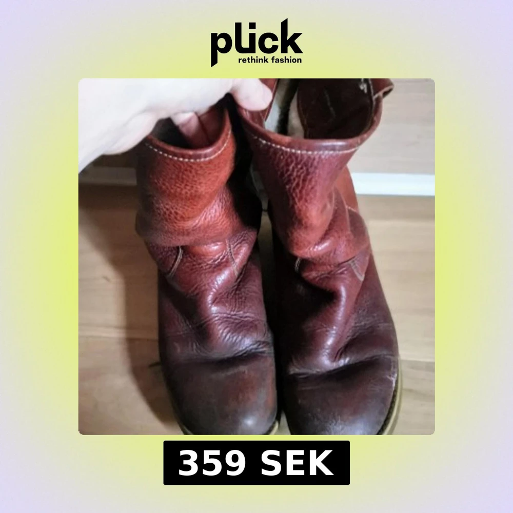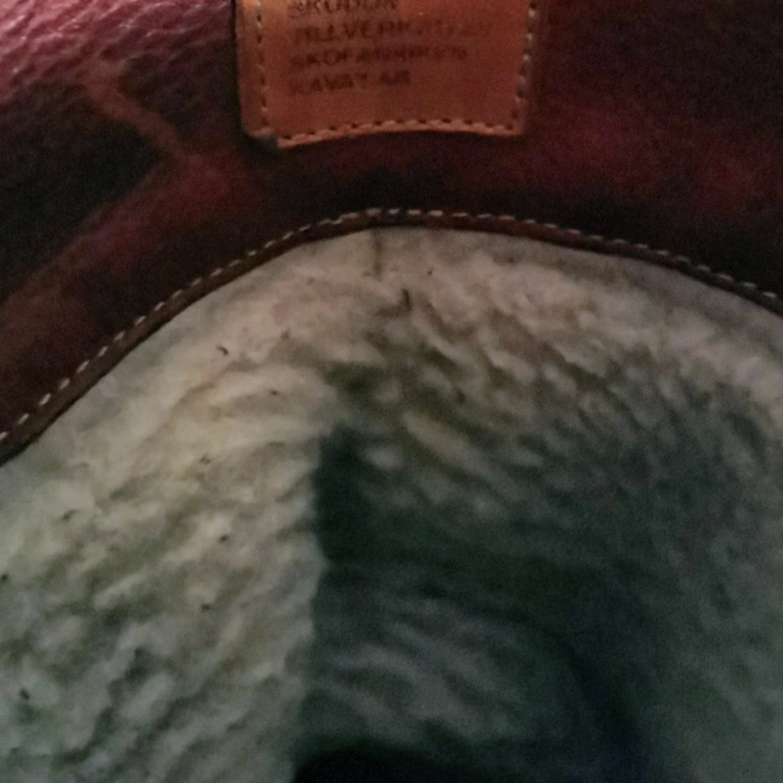 Säljer ett par bruna boots i skinn med mjukt ullfoder på insidan. Skorna har en rund tå och platt sula, perfekt för kyligare dagar. De har en enkel design utan snörning eller dragkedja och är tillverkade i äkta skinn. Det syns att de är använda både inuti och utanpå. Men de är hela. De har bruksspår. Liknande kostar minst 2200 på hemsidan. Jag minns att de ska vara skinn/läder och så ull eller fårskinn. Det står inuti dem att de är ekologiska. Men jag hittar inte infon inuti. De är varma. Rejäla