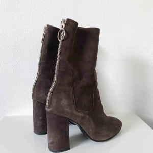 Svarta höga stövlar med spetsig tå - Säljer ett par svarta höga stövlar i mocka med spetsig tå och klack då dem ej passa mig. Snyggt band med guldfärgad detalj upptill. Perfekta för dig som vill ha en stilren och edgy look till hösten eller vintern. Bra skick, fick dom av min syster