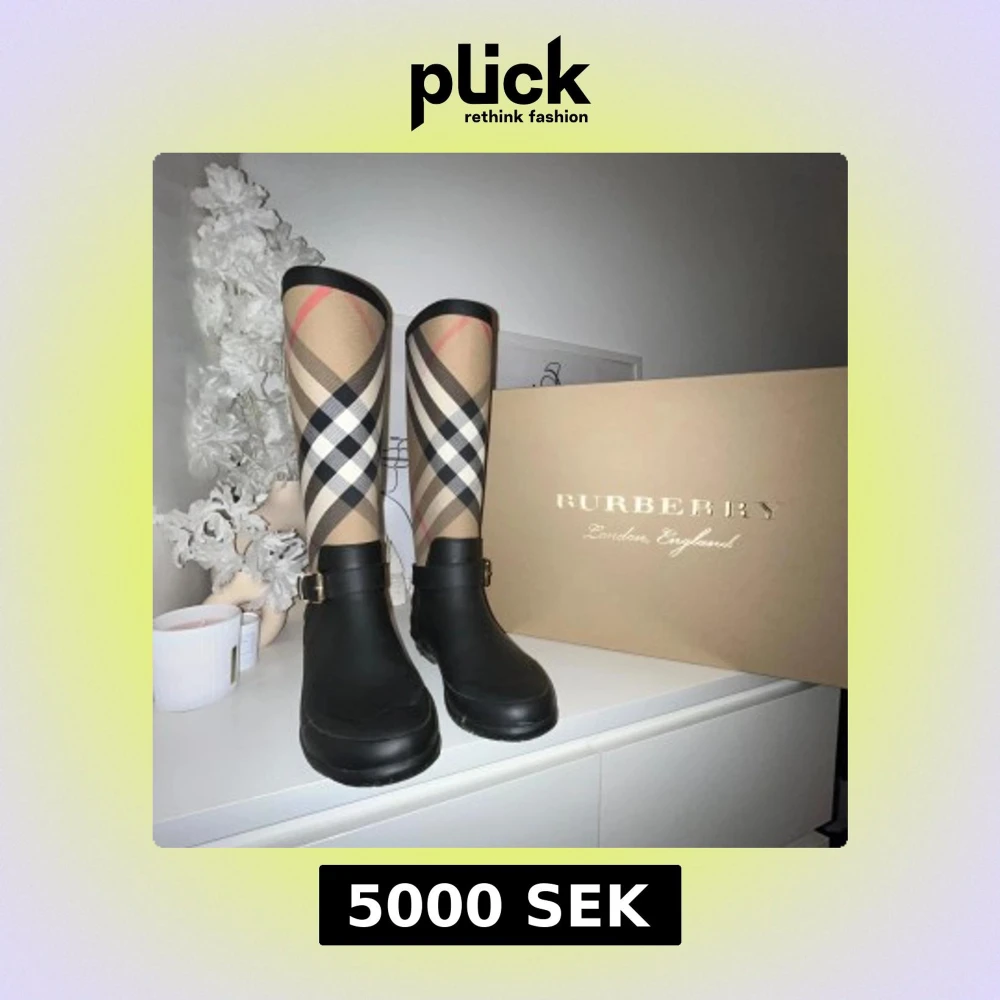Snygga stövlar från Burberry med klassiskt rutig mönster i beige, svart och röd. Stövlarna har en dekorativ spänne och är perfekta för regniga dagar. De är både stiliga och praktiska.