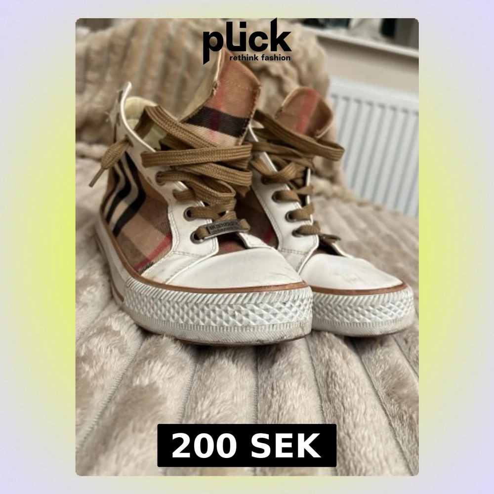 Säljer ett par high-top sneakers från Burberry med klassiskt rutig mönster i beige, brunt, svart och rött. Skorna har vita detaljer i skinn, bruna snören och rund tå. Snygg metallplatta med Burberry-logga vid snörningen och tydlig Burberry-etikett på hälen.