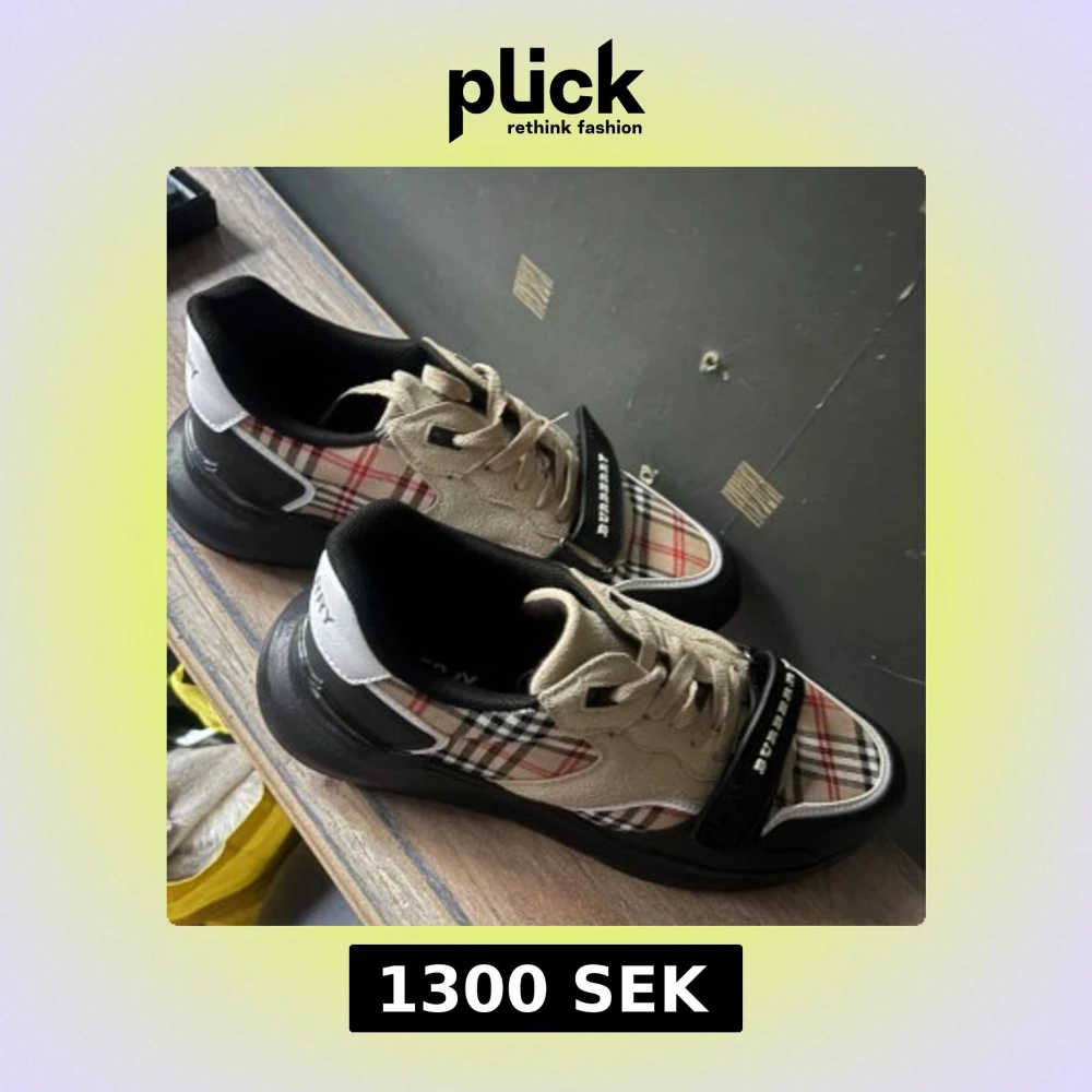 Snygga Burberry sneakers med beige mockadetaljer, svart och vit sula samt det ikoniska rutmönstret i beige, svart och rött. Skorna har snörning och en svart rem med Burberry-logga över foten. Perfekta för dig som vill sticka ut med en lyxig streetstyle.Helt nya Aldirg använda
