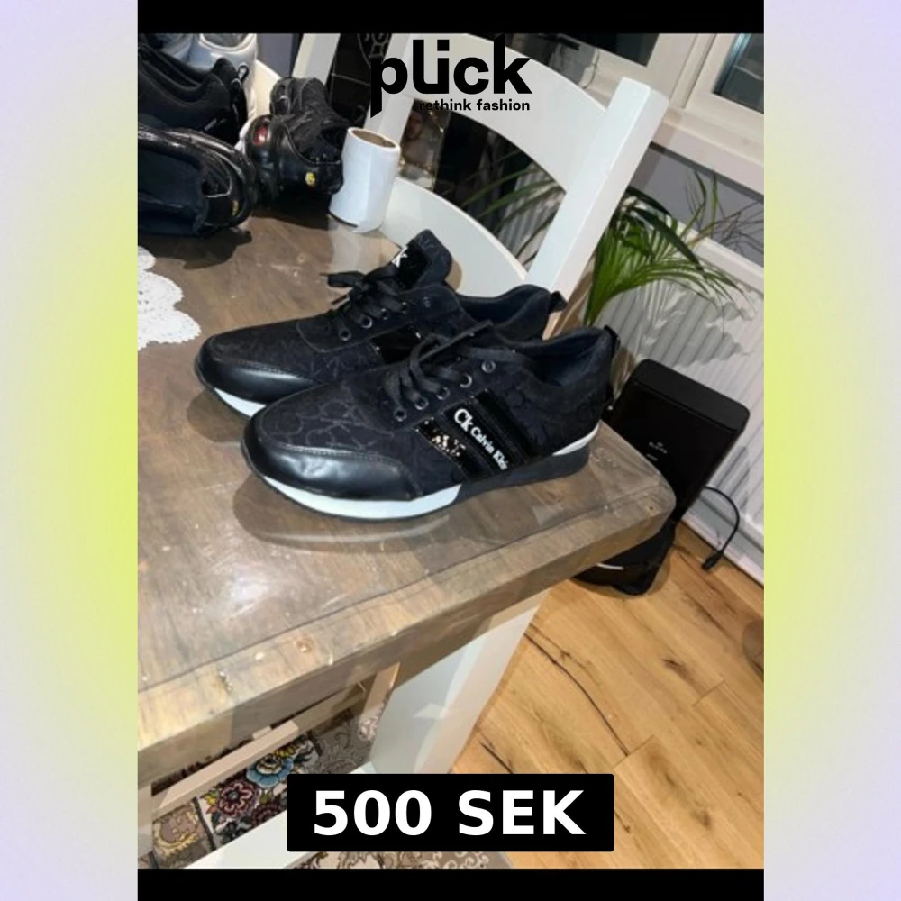Snygga svarta sneakers från Calvin Klein med CK-logga på sidan och mönstrad textil. Skorna har svarta snören, detaljer i blankt syntet och vit sula med röd detalj under. Mix av textil och syntetmaterial, rund tå och platt sula. Perfekt för dig som gillar stilrena och trendiga sneakers.