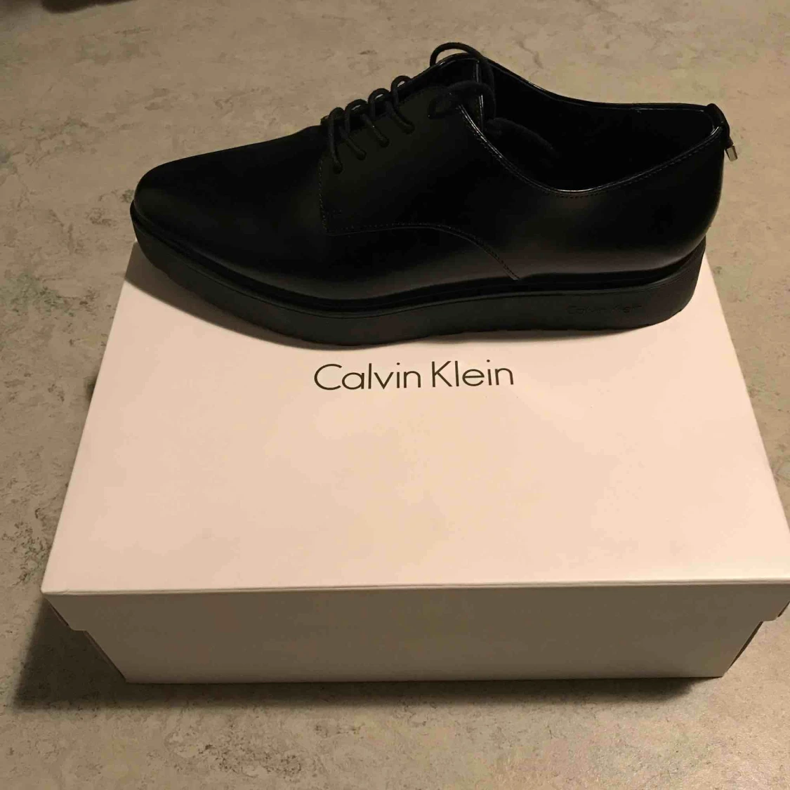 Sprillans nya kostymskor från Calvin Klein. Materialet är lackat skinn, de är matta i ”lacken”. Storlek 40. Ordpris: 1599 :-