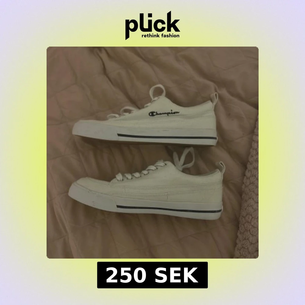 Snygga vita sneakers från Champion med klassisk låg profil och rund tå. Skorna har vita snören och är tänkt att använda inomhus, därav kan jag inte garantera att de är vattentäta. Champion-loggan är broderad i svart på sidan. Yttersulan är gummibrun. Använda 1 gång. Vid frågor eller fler bilder, kontakta mig.