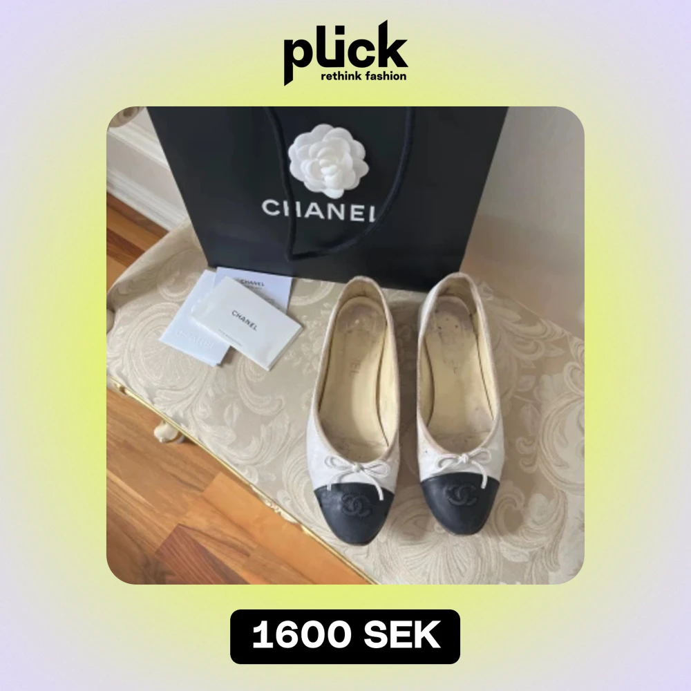 Vackra Chanel ballerina i vit med svart tå, välanvända men kan nog bli väldigt fina med en ny sula och om man smörjer in lädret. Köpte dem secondhand