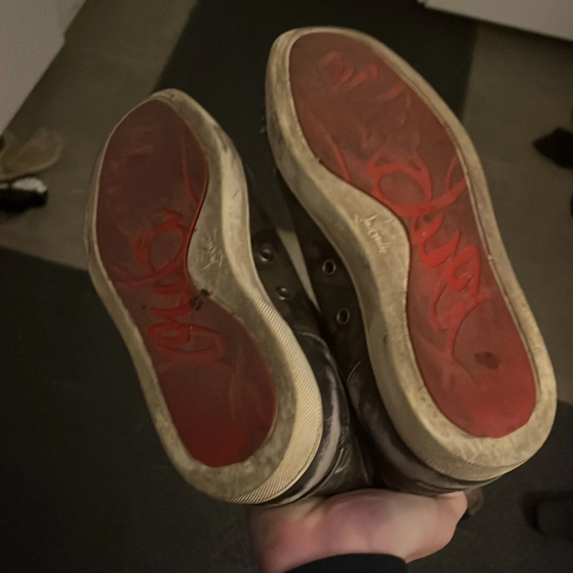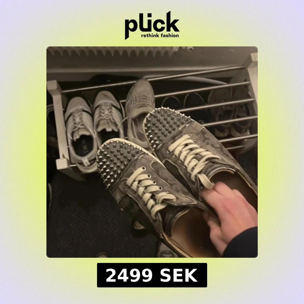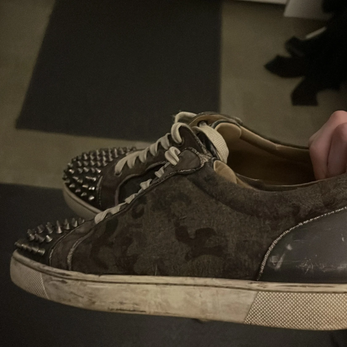 Unika sneakers från Christian Louboutin i mörkgrått kamouflagemönster med coola silverfärgade nitar på tån. Skorna har klassisk röd sula, snörning och detaljer i skinn. Perfekta för dig som vill sticka ut med en edgy vibe.