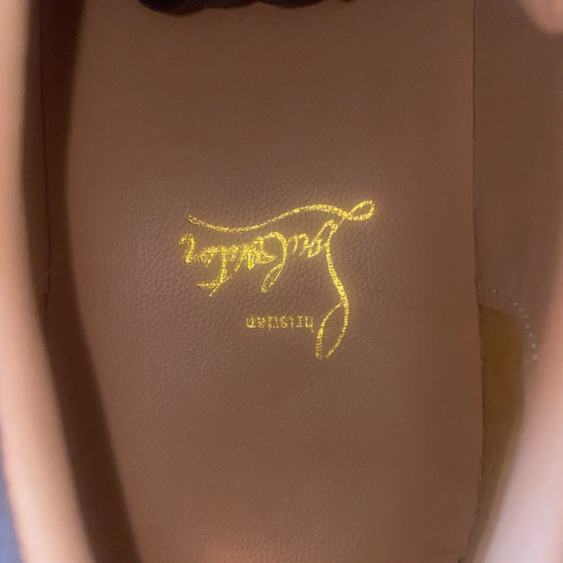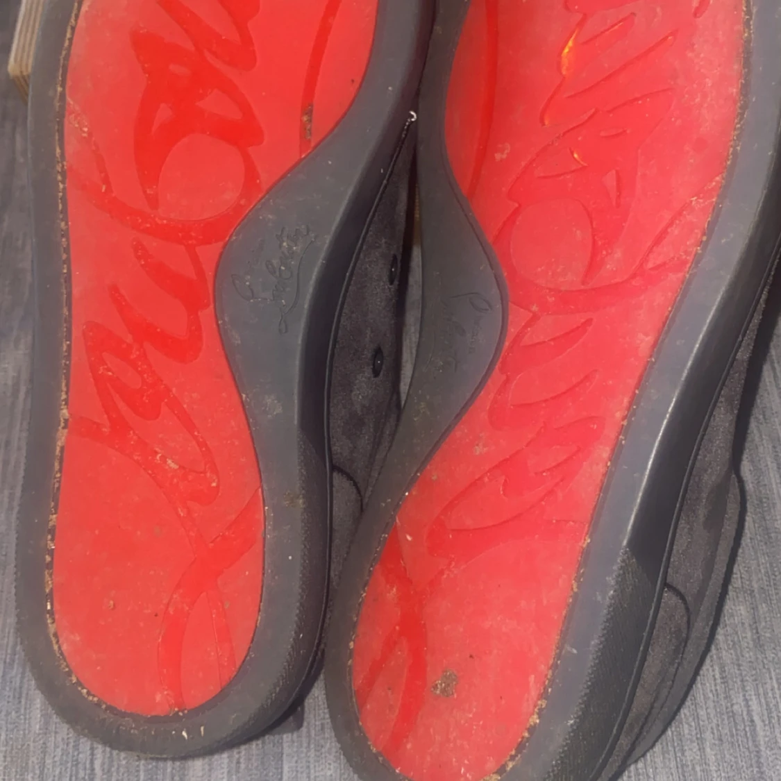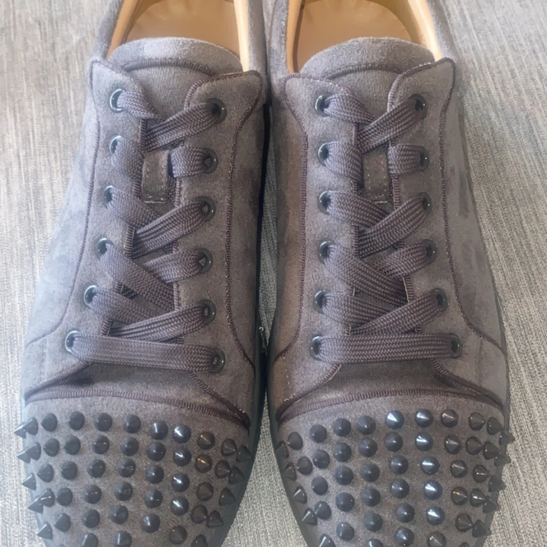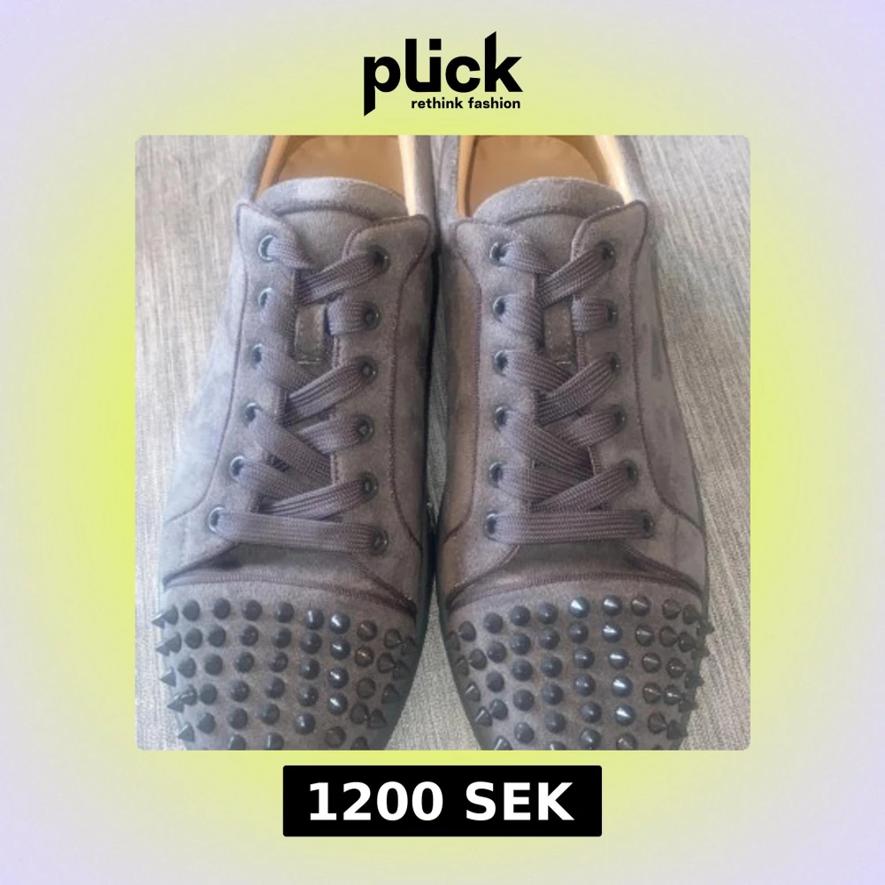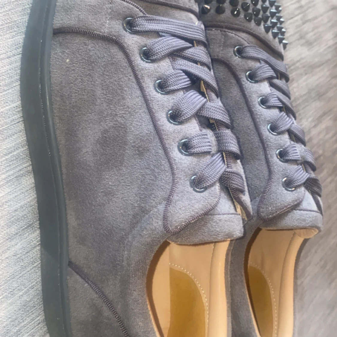 Christian louboutin skor storlek 41. Grå mocka, nitar framtill, röd sula undertill.