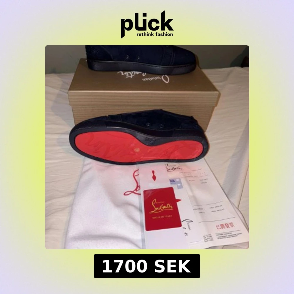 Säljer ett par marinblå sneakers från Christian Louboutin i mocka med ikonisk röd sula och broderad logga på hälen. Skorna har rund tå, platt sula och klassisk snörning. Lyxig känsla och snygg design, perfekt för dig som vill sticka ut.