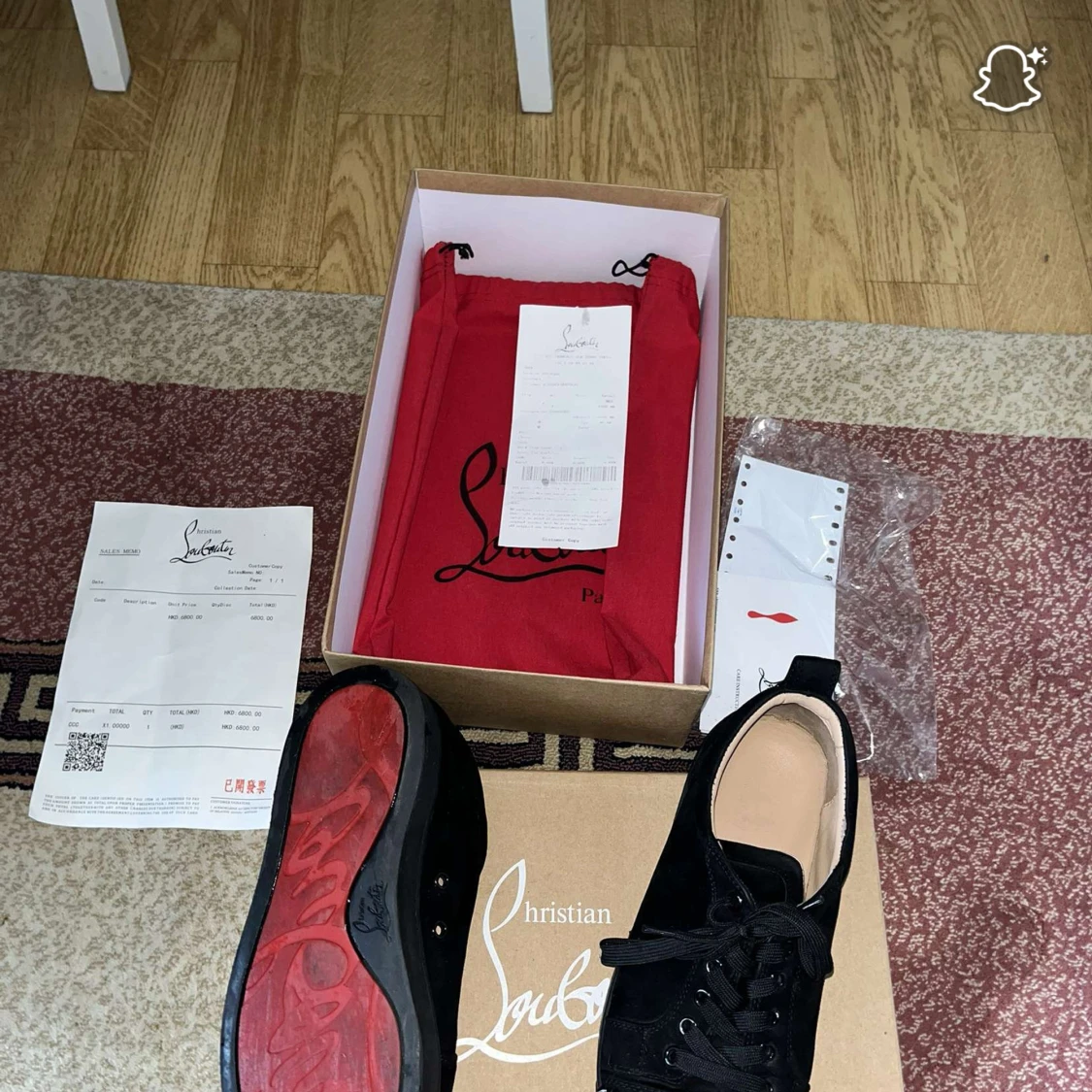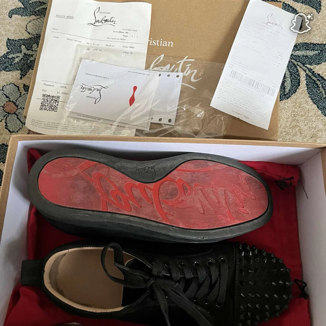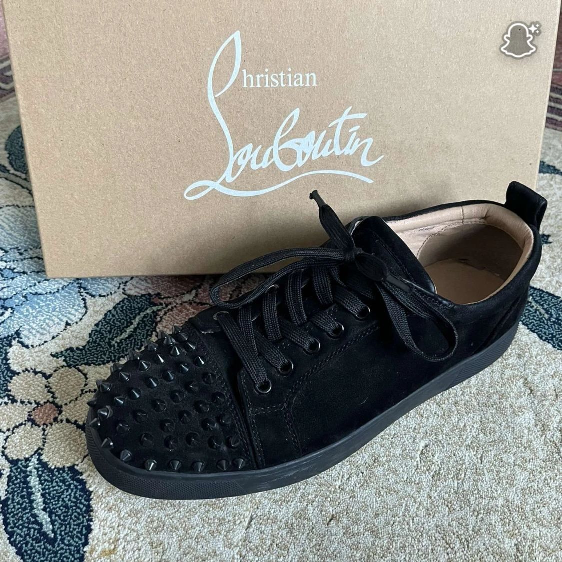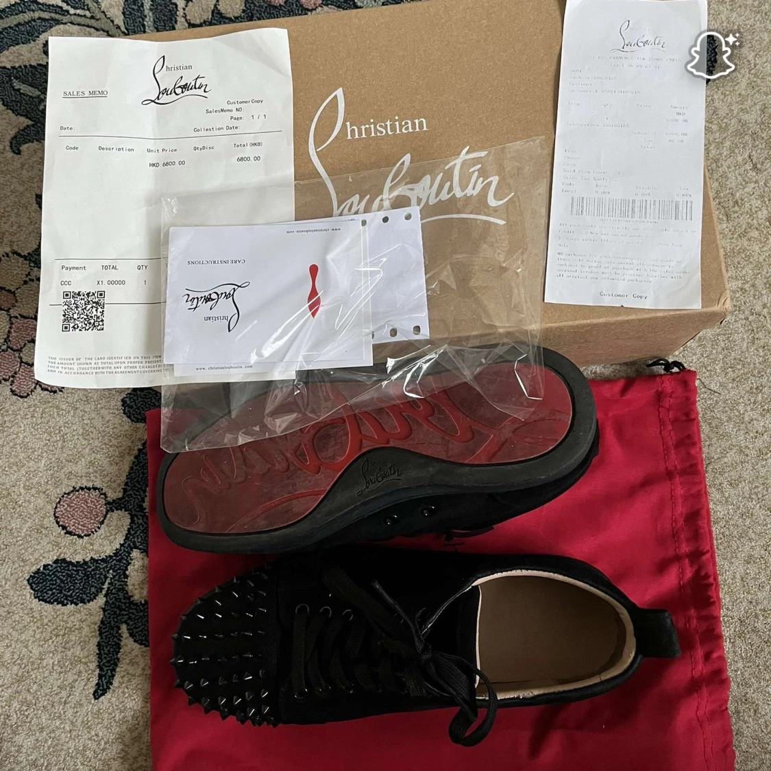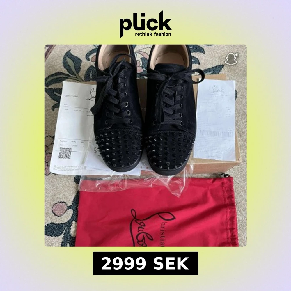 Svarta sneakers från Christian Louboutin i mocka med coola svarta nitar över tån. Skorna har snörning, rund tå och den klassiska röda sulan. Kommer med originalkartong och dustbag. Perfekta för dig som vill sticka ut med en edgy vibe.